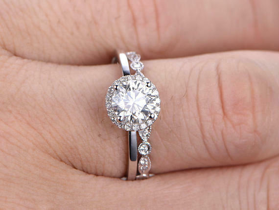 3Ct Round Cut Diamond Bridal Set Vintage Band Halo Ring 14K White Gold Finish