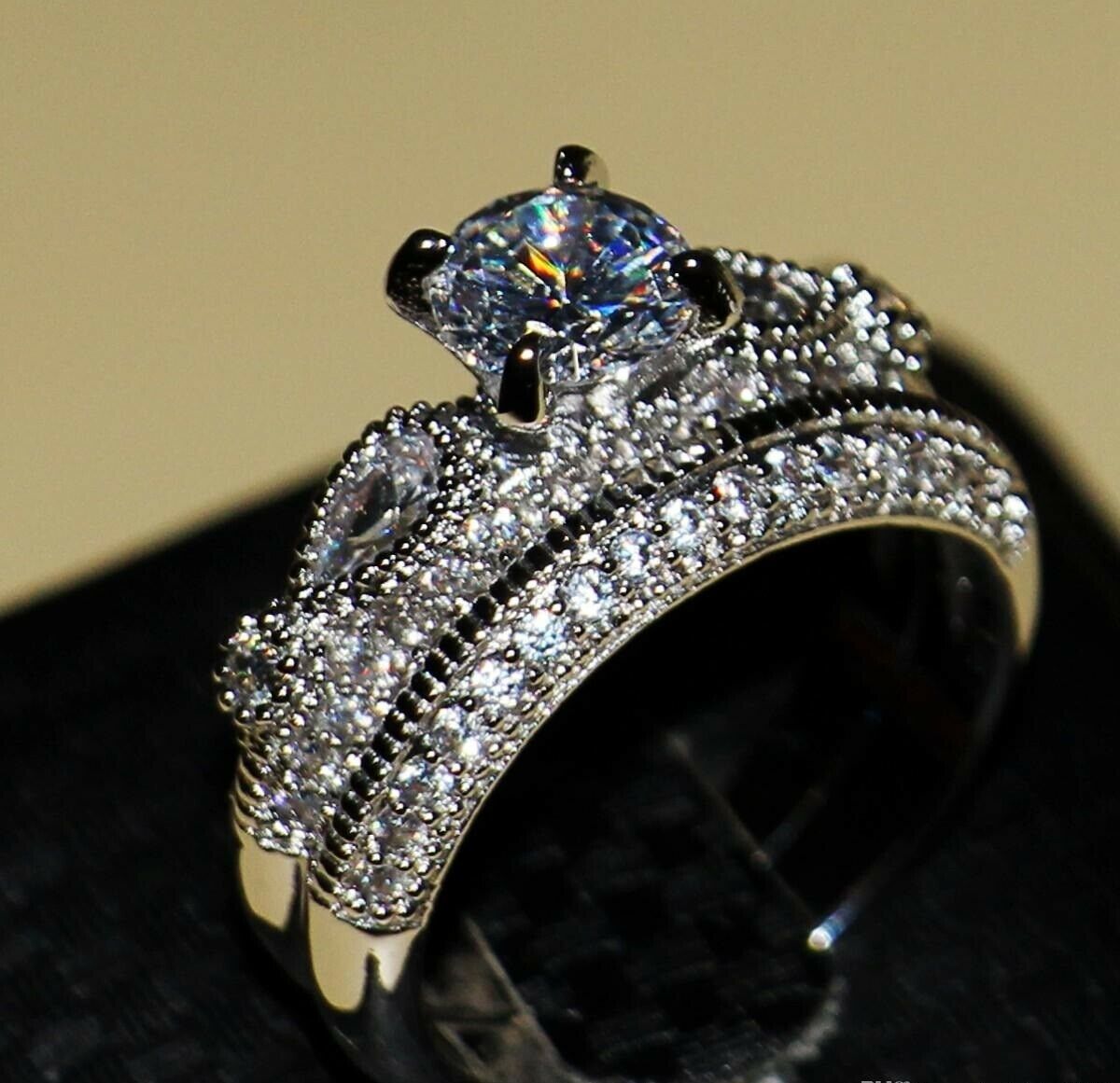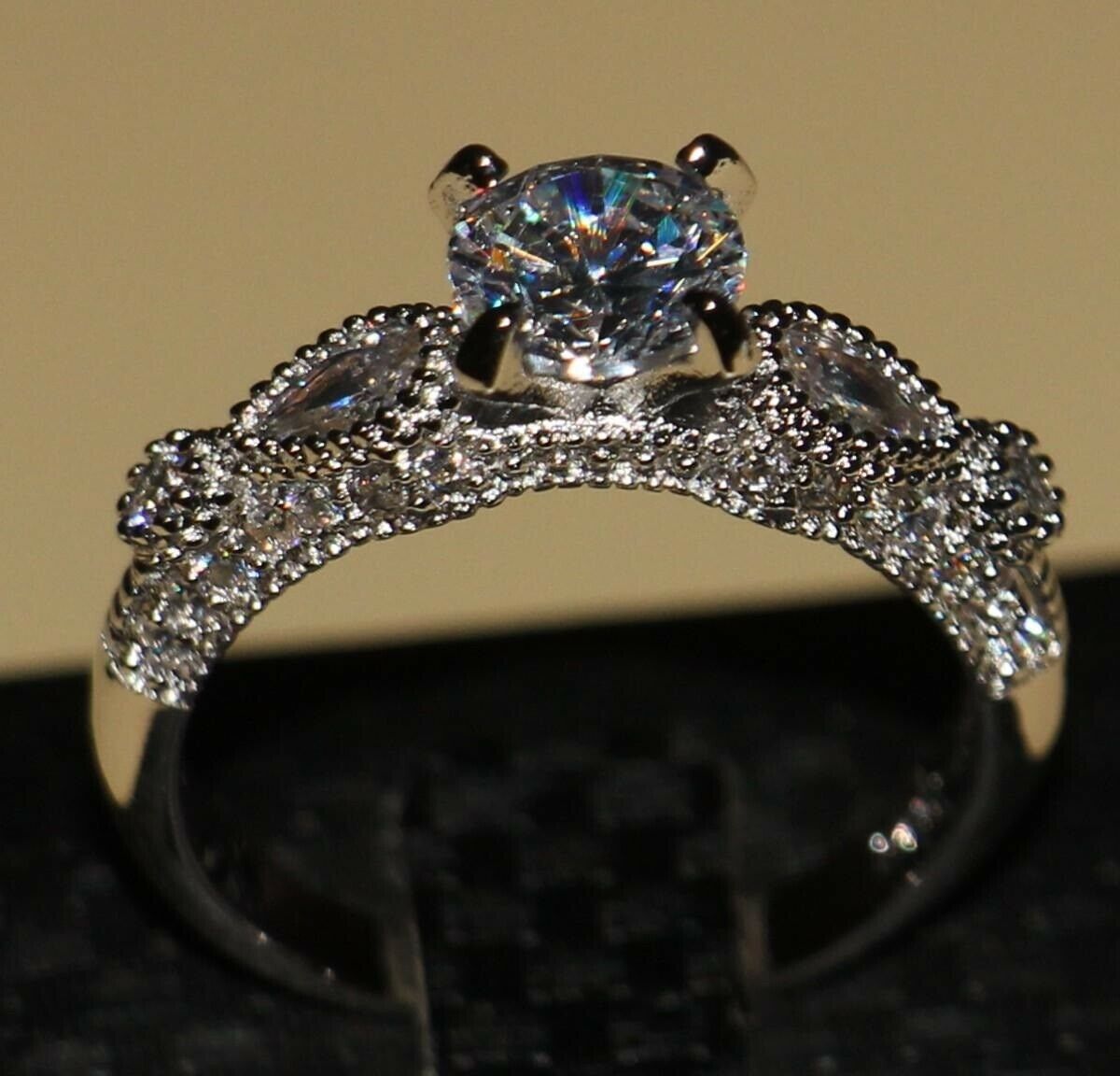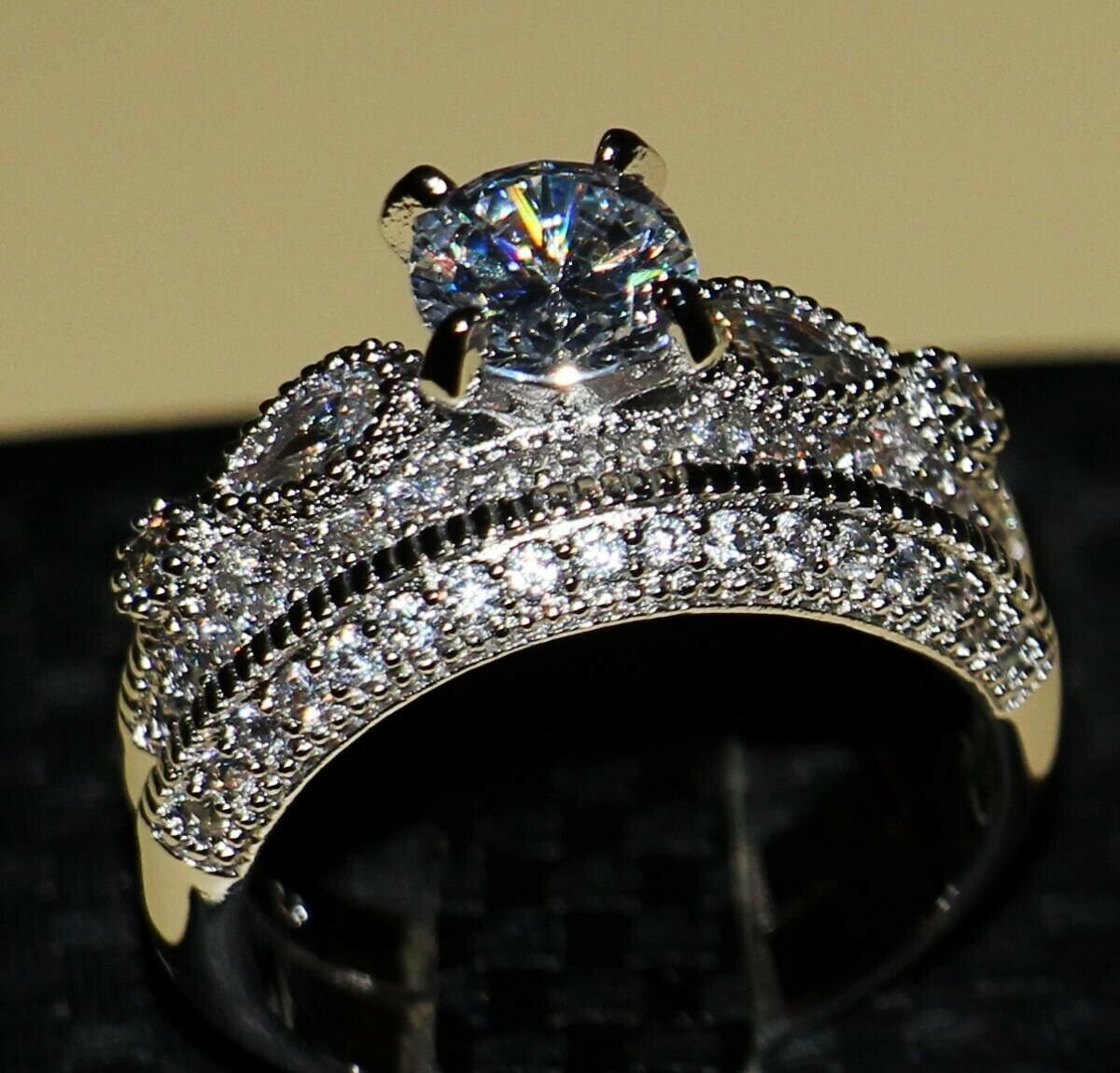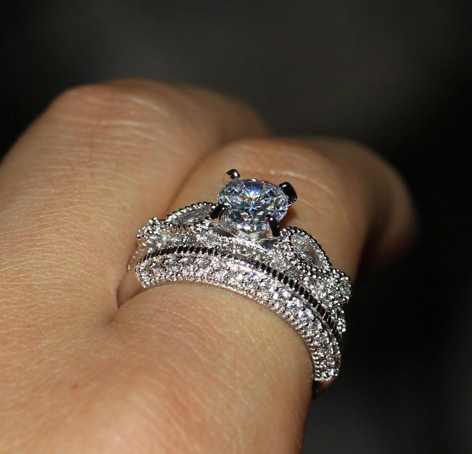 3ct Round Cut Diamond Engagement Ring 14k White Gold Finish Milgrain Bridal Set