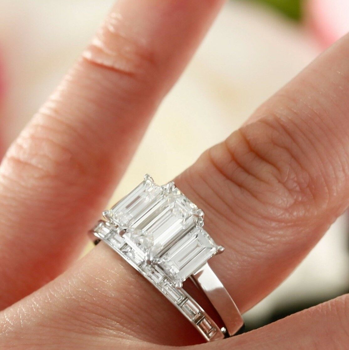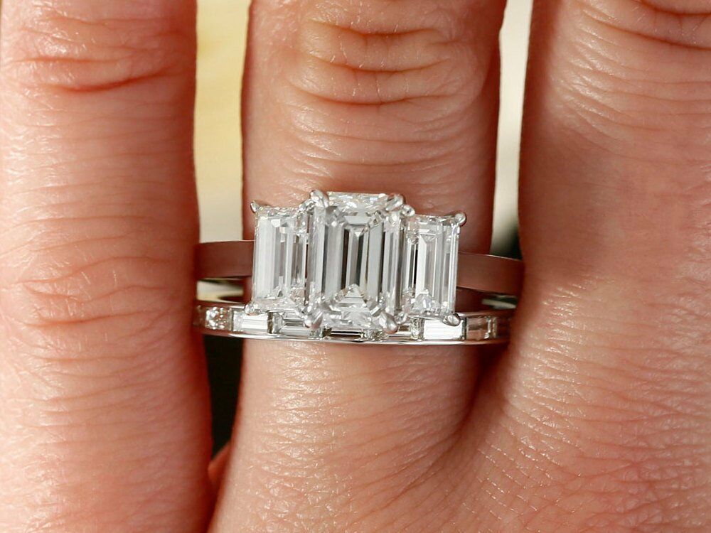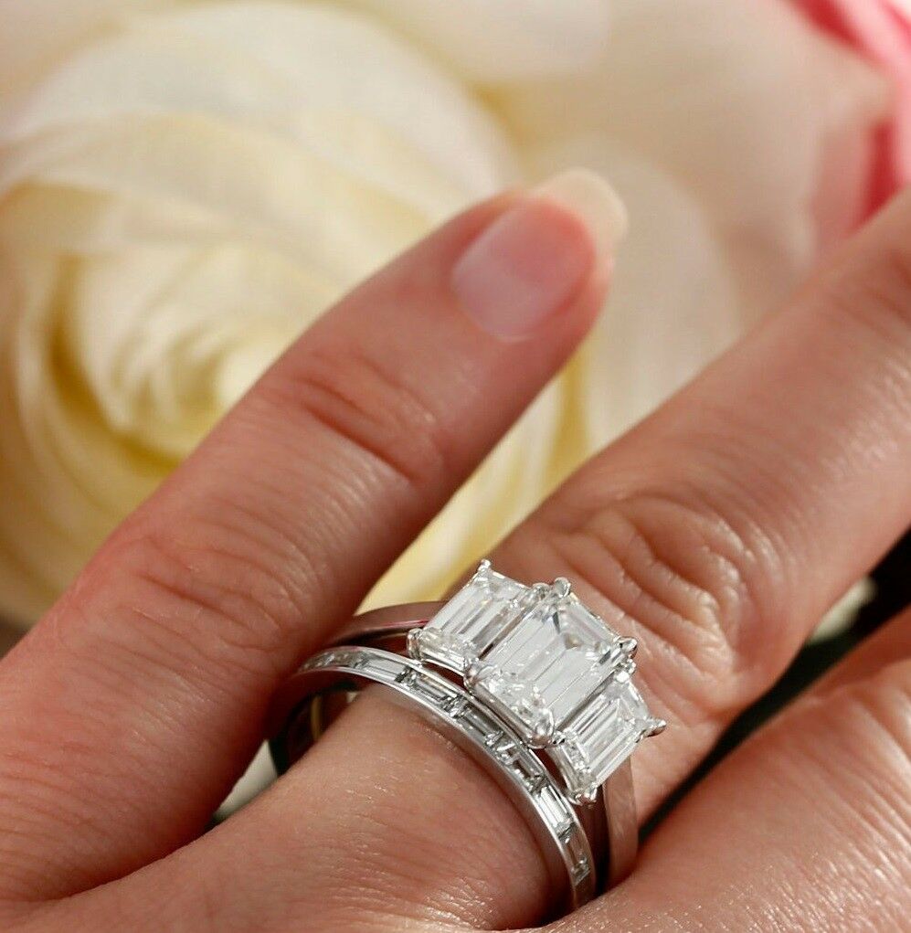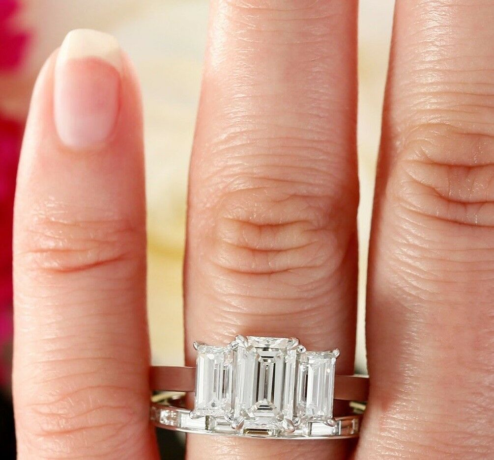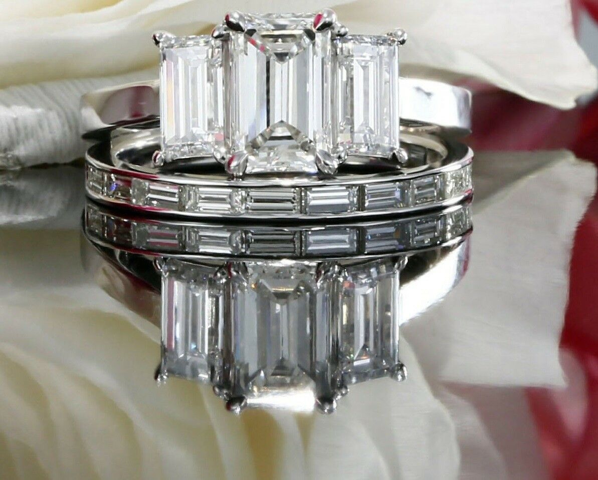 4ct Emerald Cut Diamond Bridal Set Trilogy Engagement Ring 14k White Gold Finish