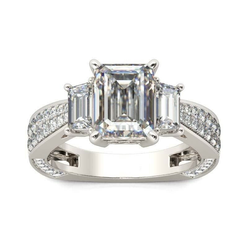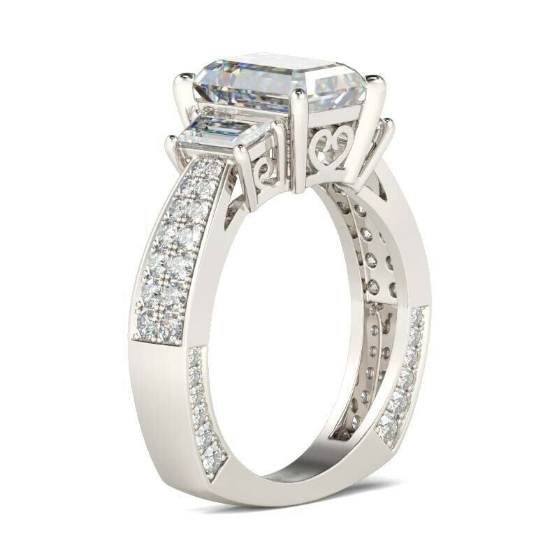 4Ct Emerald Cut Diamond Dual Row Accent Engagement Ring 14K White Gold Finish