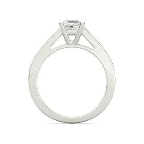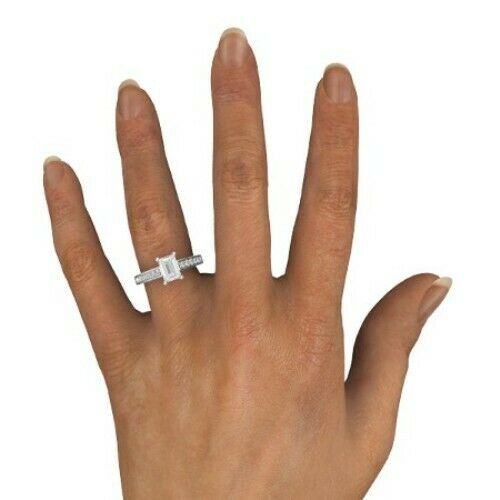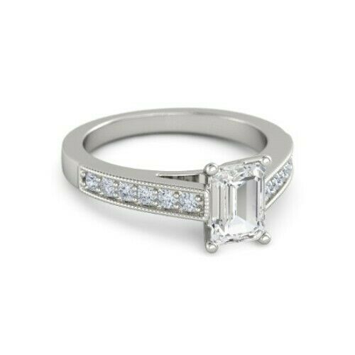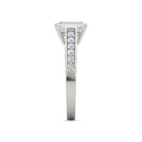 4Ct Emerald Cut Diamond Milgrain Round Accent Solitaire Ring 14K White Gold Over