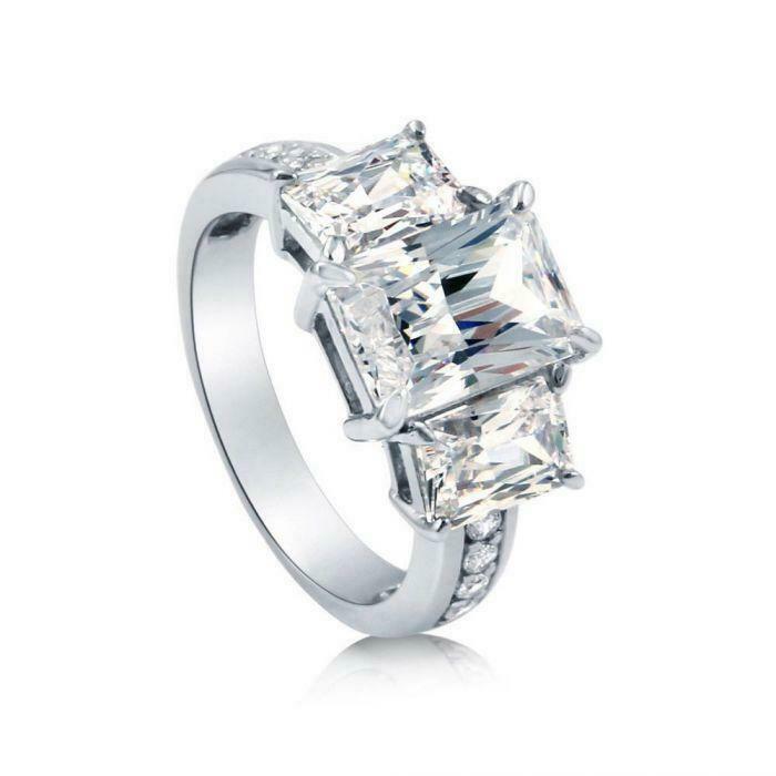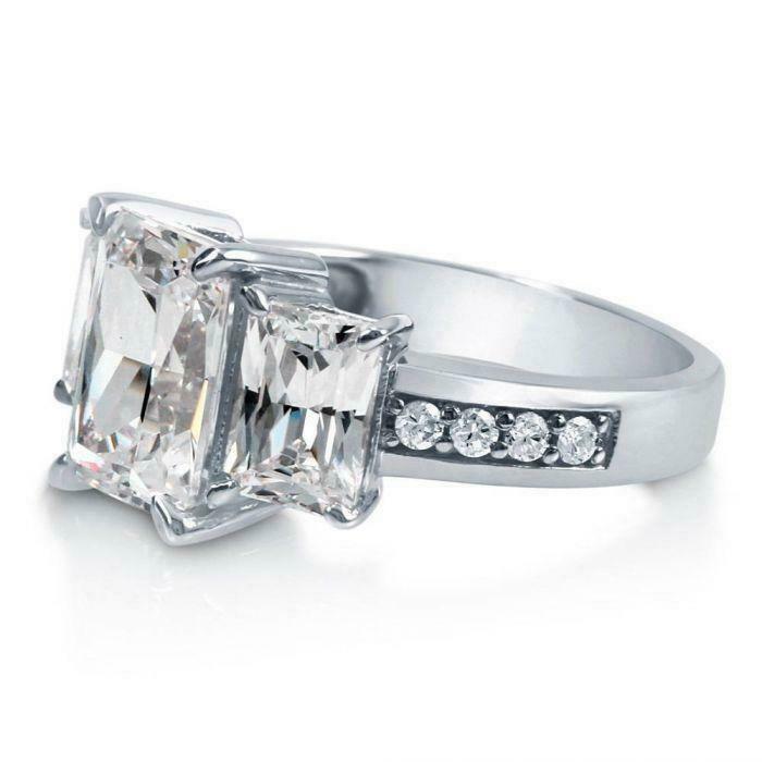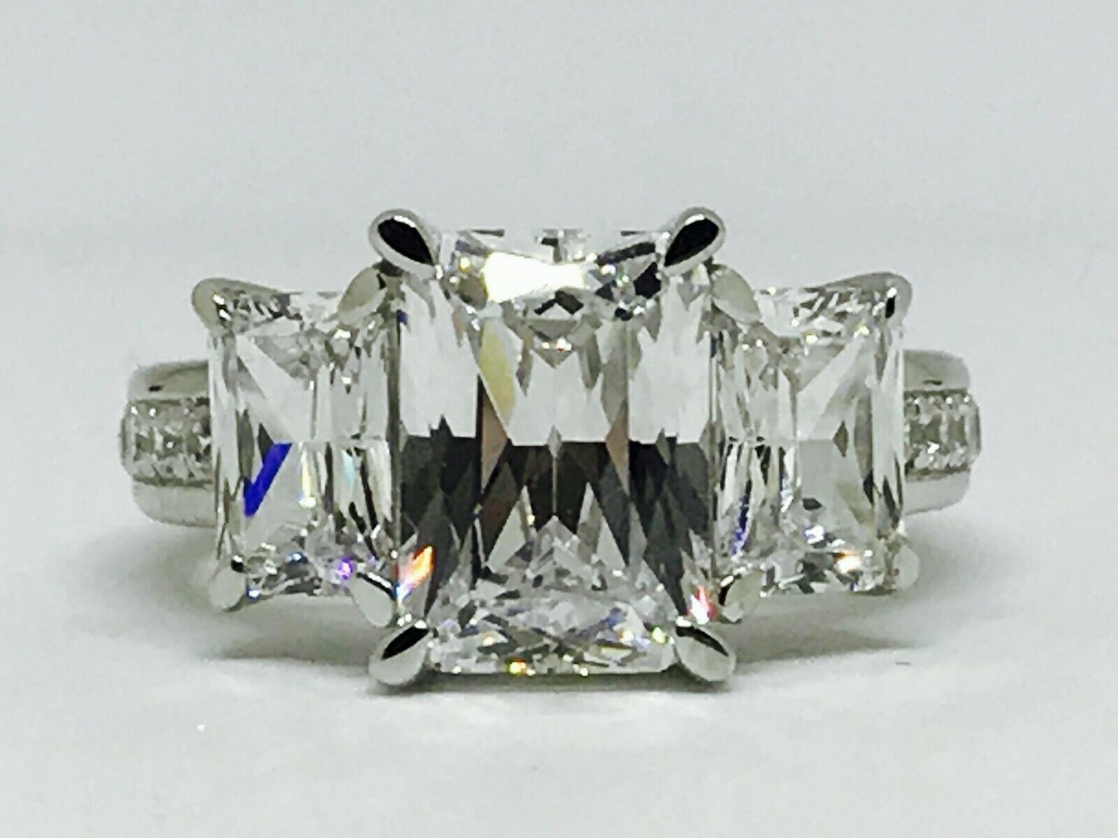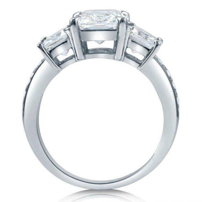 4Ct Emerald Cut Diamond Three Stone Ring 14K White Gold Finish with Round Accent