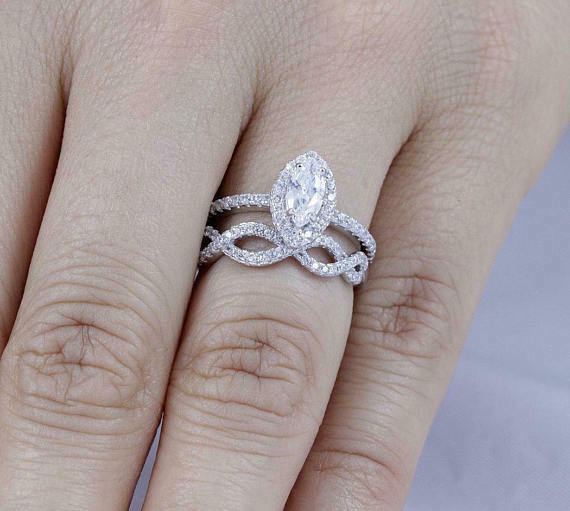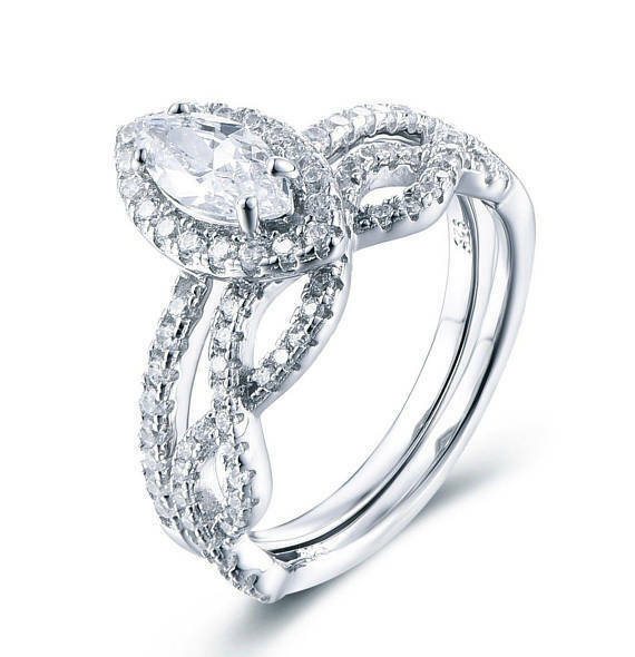 4Ct Marquise Cut Diamond Bridal Set Halo Ring Infinity Band 14K White Gold Over