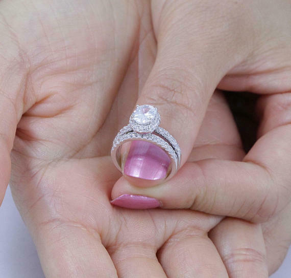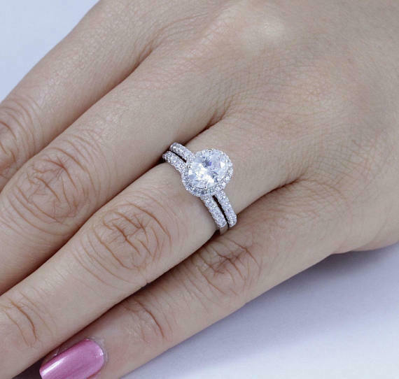 4Ct Oval Cut VVS1/D Diamond Bridal Set Halo Ring Band 14K White Gold Finish