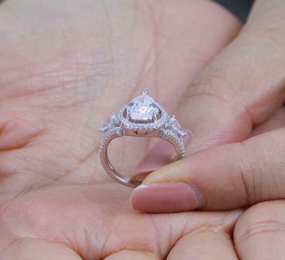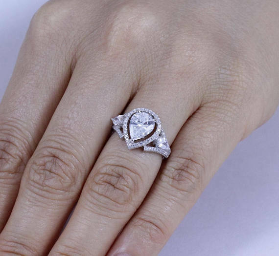 4Ct Pear Cut Diamond Stylish Halo Art Deco Engagement Ring 14K White Gold Finish