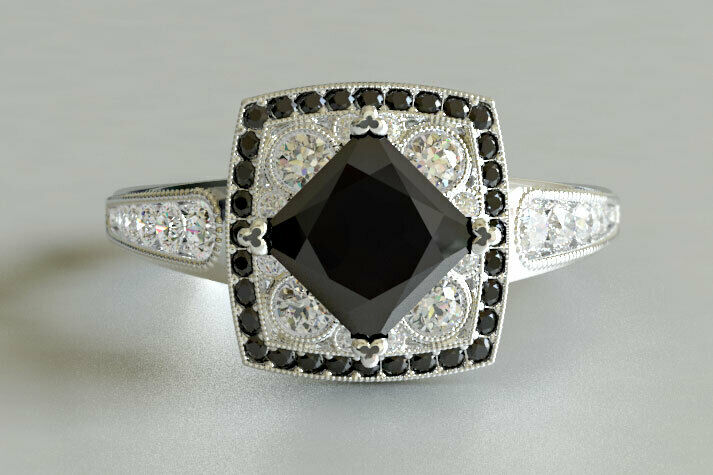4ct Princess Cut Black Diamond Engagement Ring Art Deco 14k White Gold Finish