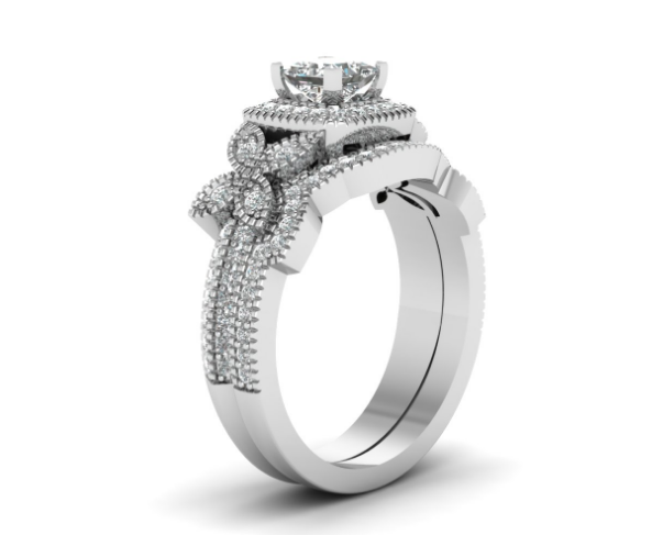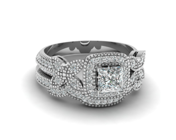 4Ct Princess Cut Diamond Bridal Set Vintage Milgrain Halo 14K White Gold Finish