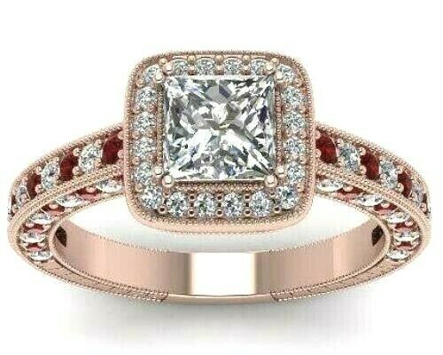 4Ct Princess Cut Diamond Halo Engagement Ring 14K Rose Gold Finish Ruby Accents