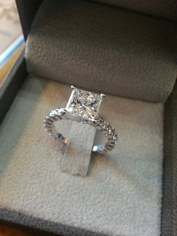 4Ct Princess Cut Diamond Solitaire Ring 14K White Gold Finish with Round Accents