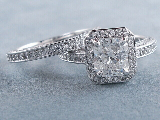 4Ct Radiant Cut VVS1D Diamond Bridal Set Halo Ring Band 14K White Gold Finish