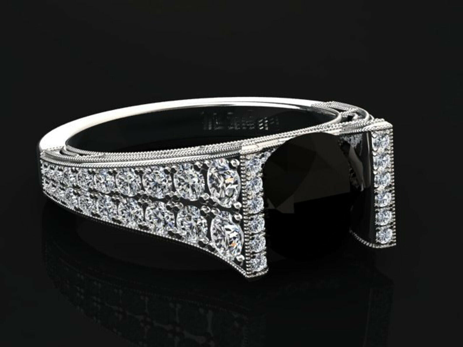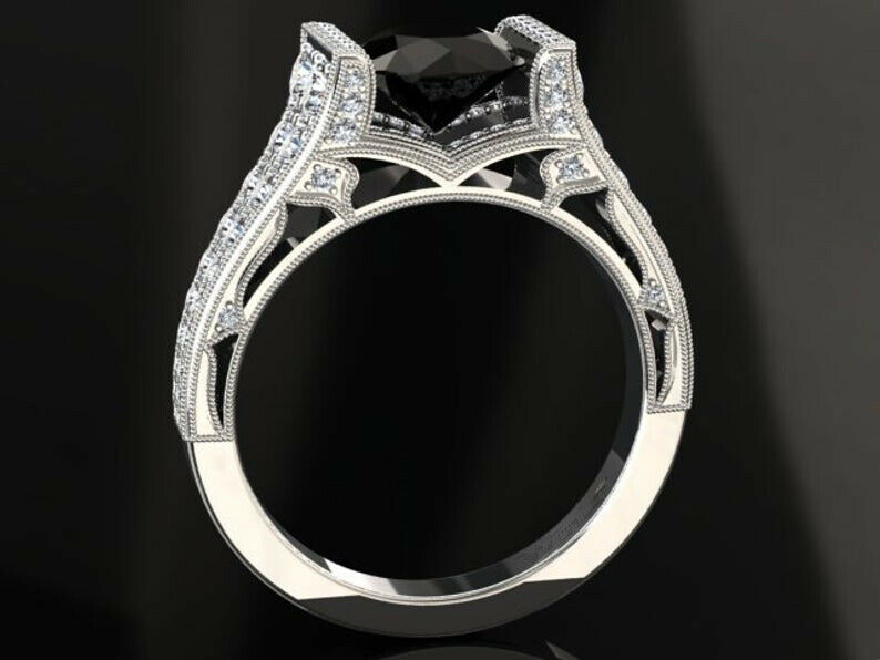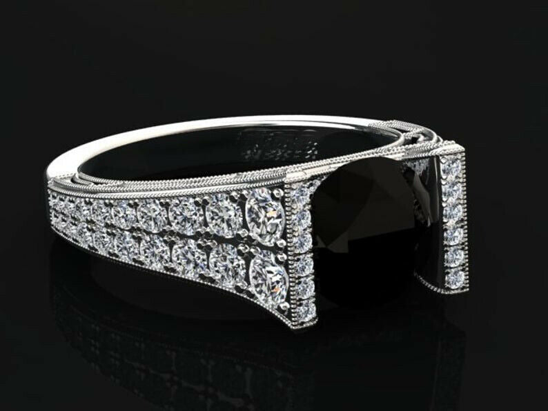 4ct Round Cut Black Diamond Dual Row Accent Solitaire Ring 14k White Gold Finish