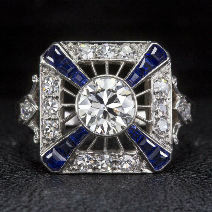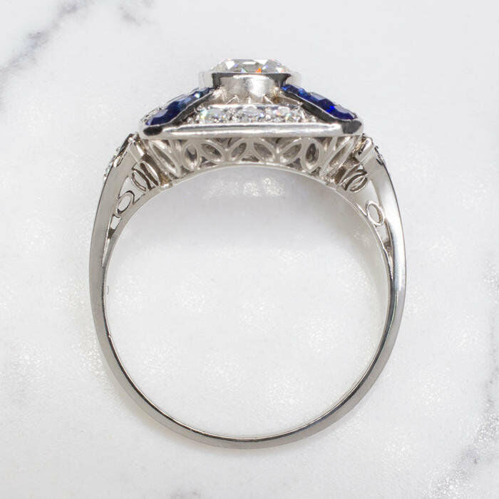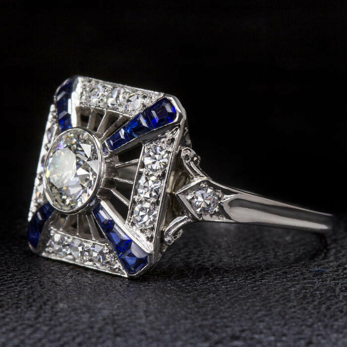 4Ct Round Cut Diamond Art Deco Ring 18K White Gold Finish Blue Sapphire Accents