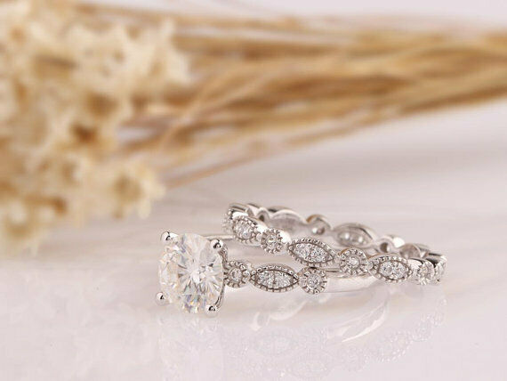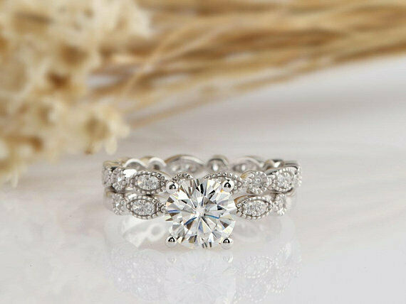 4Ct Round Cut Diamond Bridal Set Milgrain Vintage Solitaire 14K White Gold Over