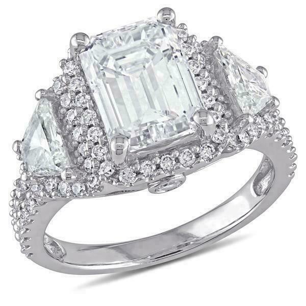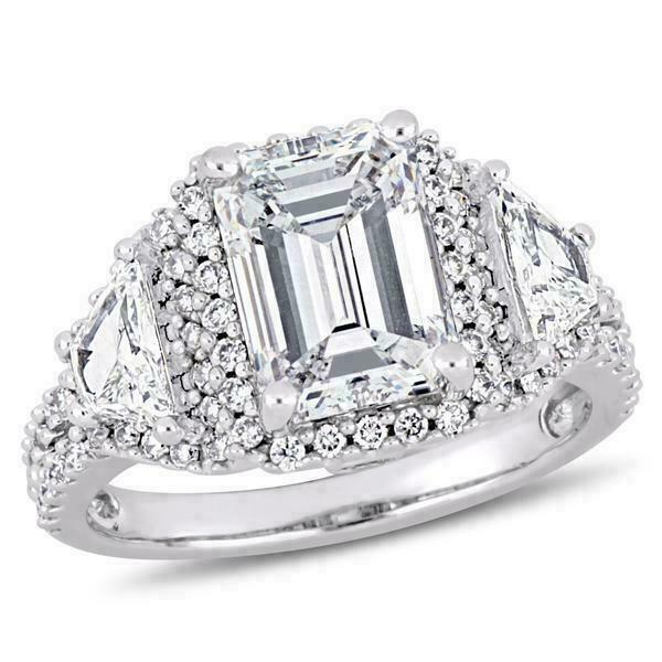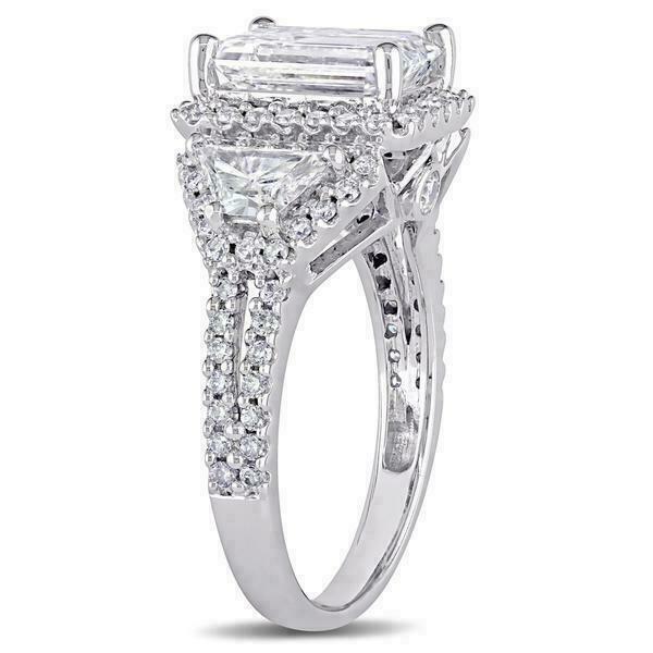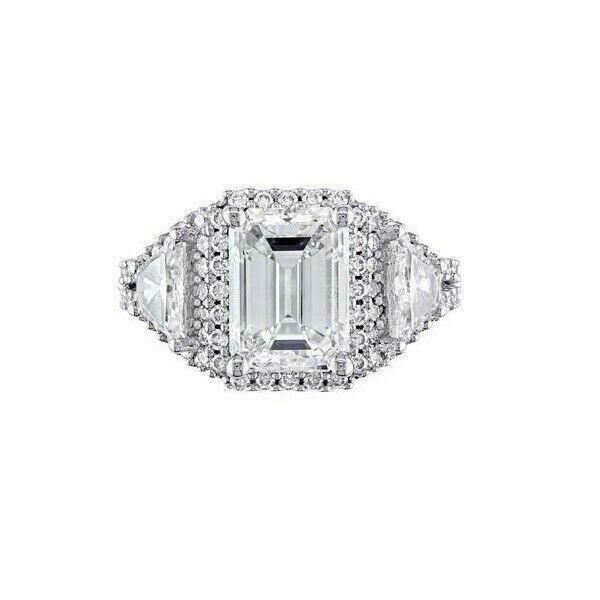 5.5ct Emerald Cut Diamond Halo Iced Trilogy Engagement Ring 14K White Gold Over