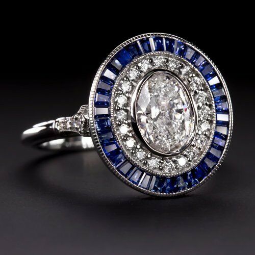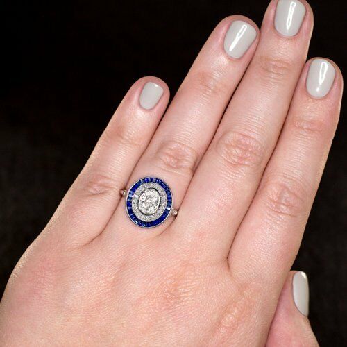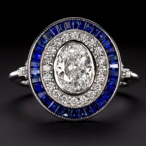 5Ct Oval Cut Diamond Sapphire Halo Art Deco Engagement Ring 18K White Gold Over