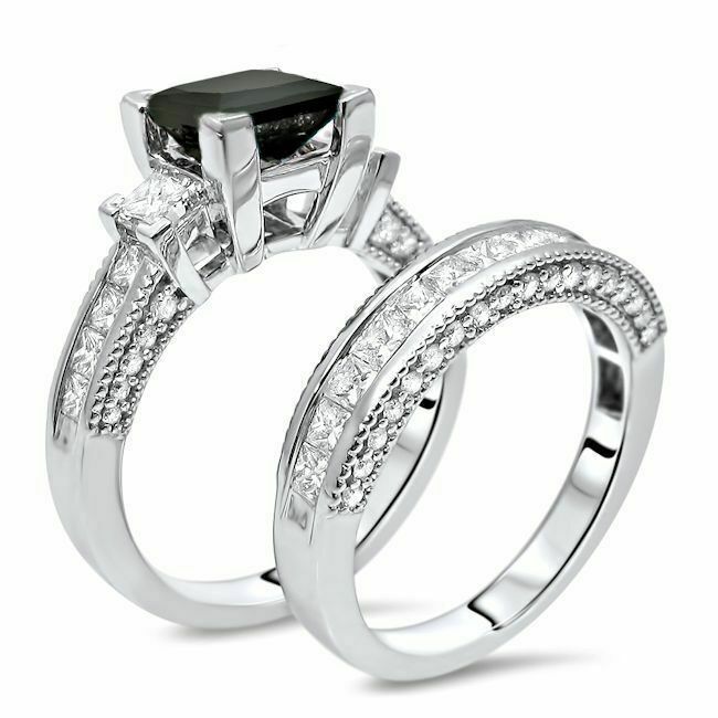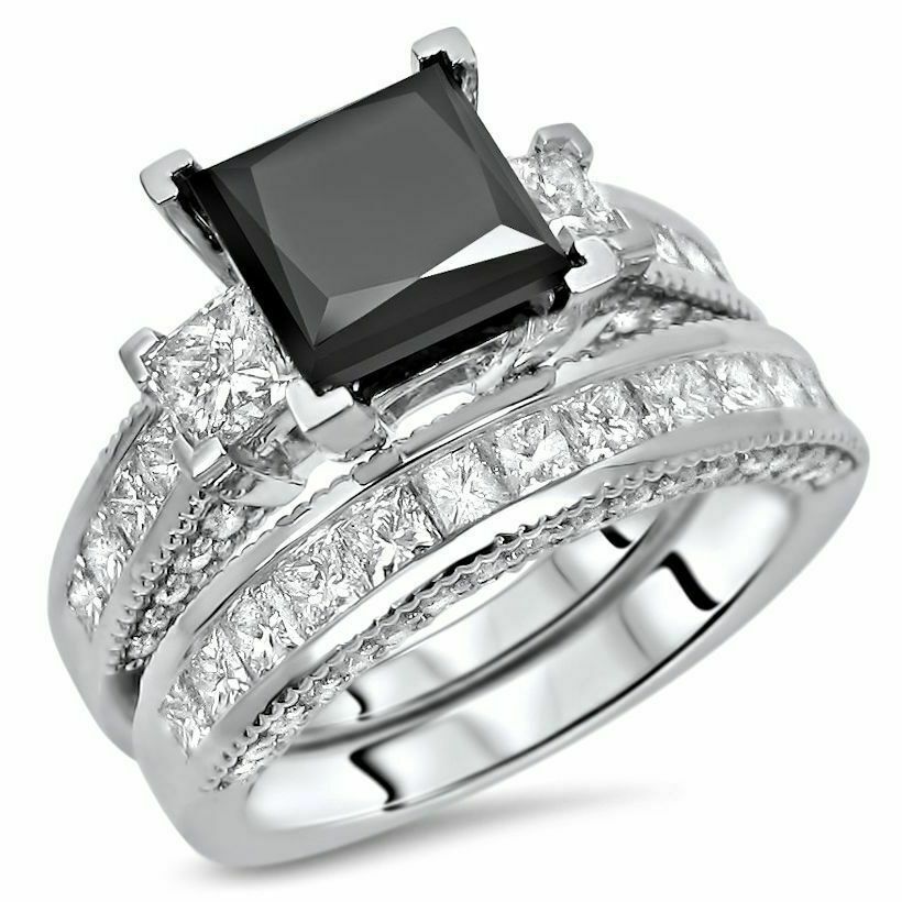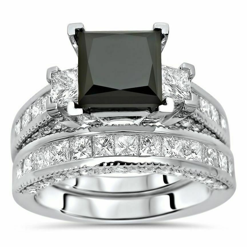 5Ct Princess Cut Black Diamond Stylish Bridal Set Band Ring 14K White Gold Over