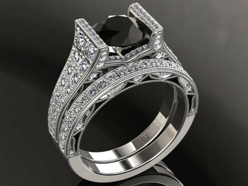 5ct Round Black Diamond Engagement Ring Dual Row Bridal Set 14k White Gold Over