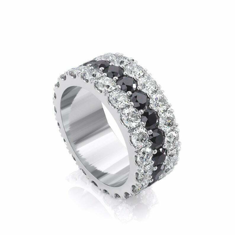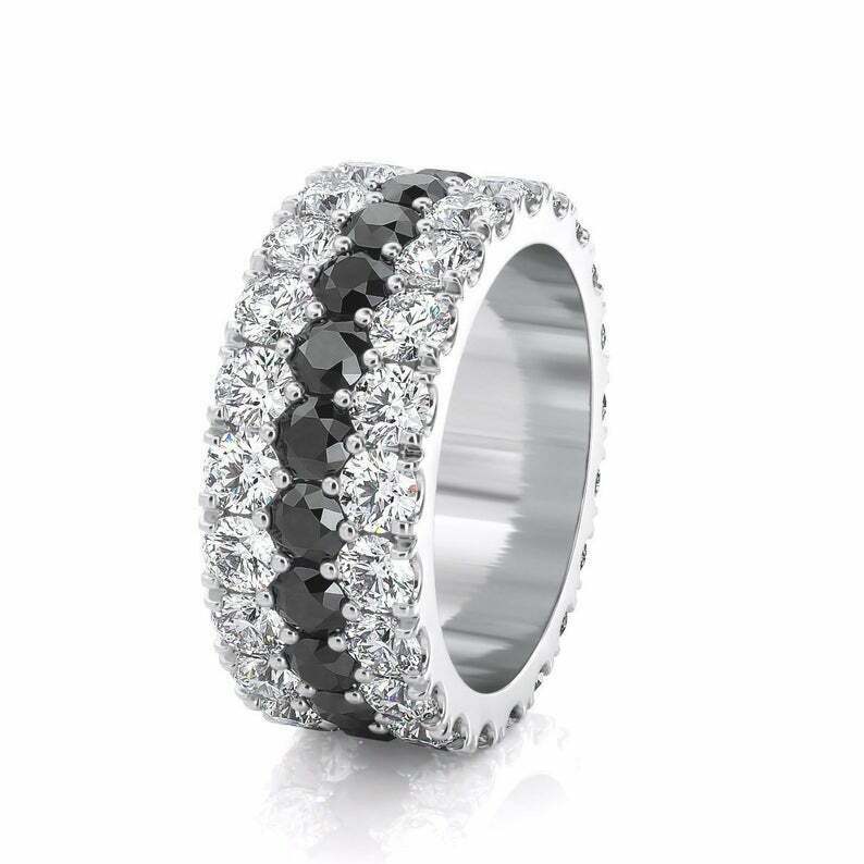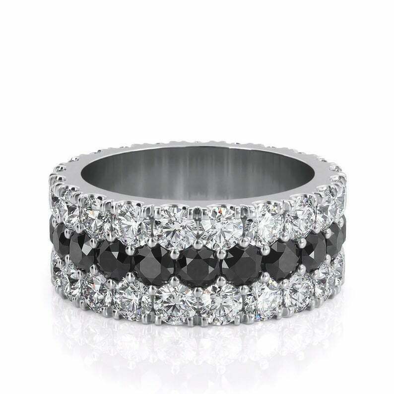 5ct Round Cut Black & White Diamond Three Row Eternity Wedding Band 14k White Gold Over
