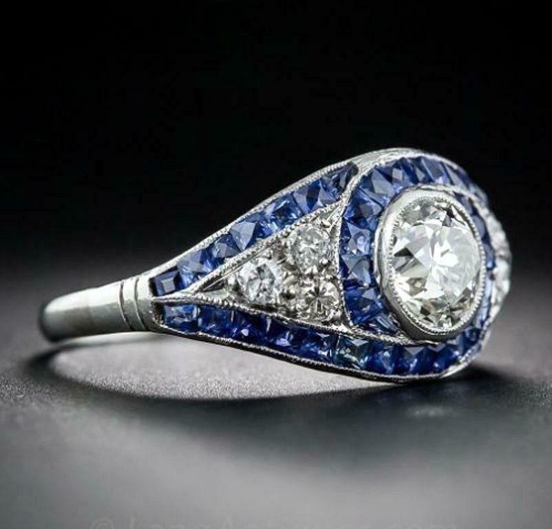 5Ct Round Cut Diamond Blue Sapphire Art Deco Engagement Ring 14K White Gold Over