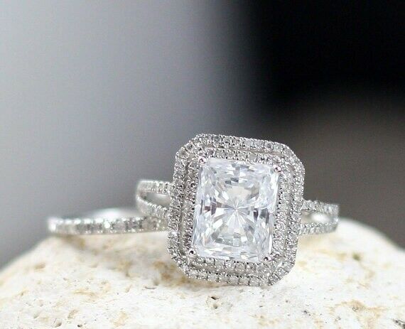 6Ct Radiant Cut Diamond Bridal Set Dual Halo Ring Band 14K White Gold Finish