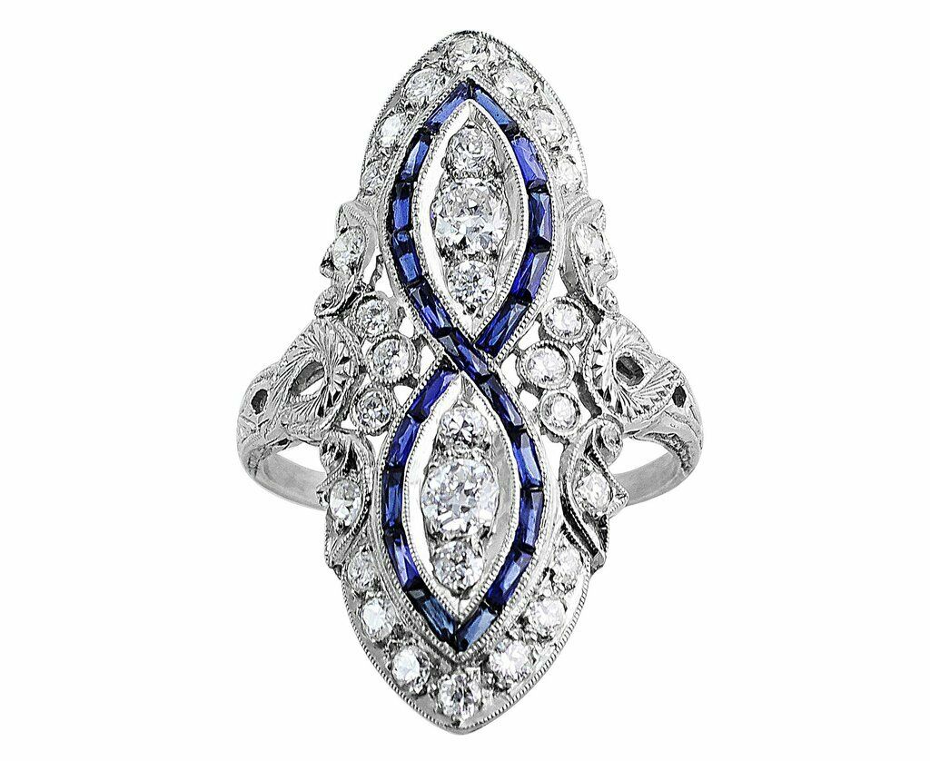 6Ct Round Cut Diamond Blue Sapphire Vintage Art Deco Ring 14K White Gold Finish