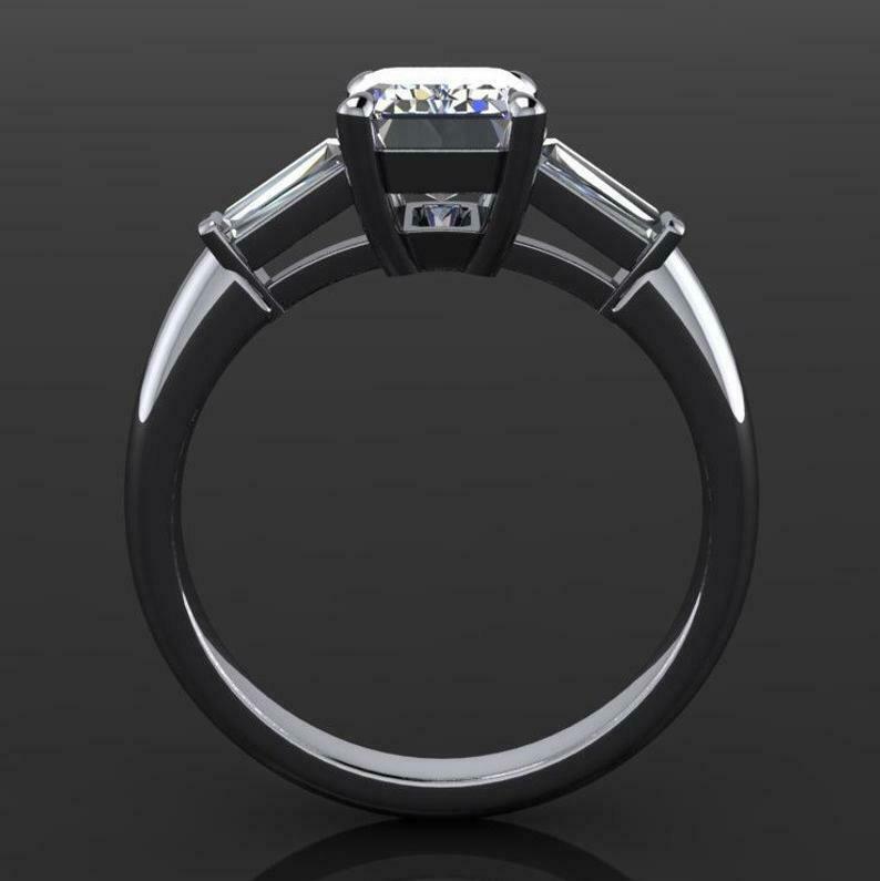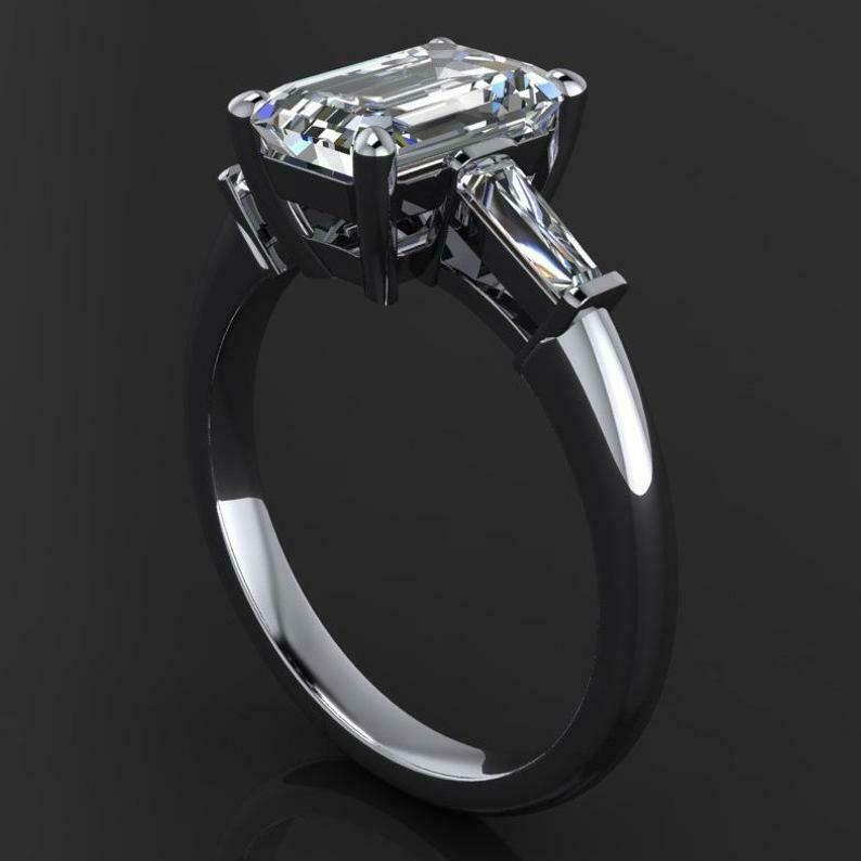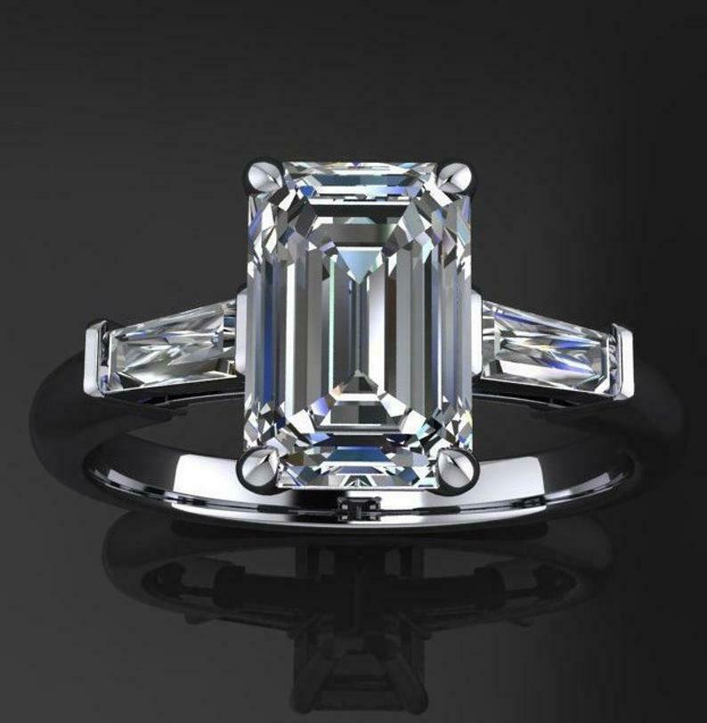 Baguette Accents Trilogy Engagement Ring 2ct Emerald Cut Diamond 14k White Gold Over