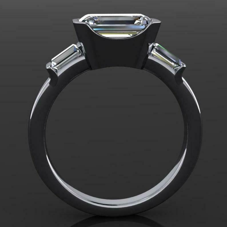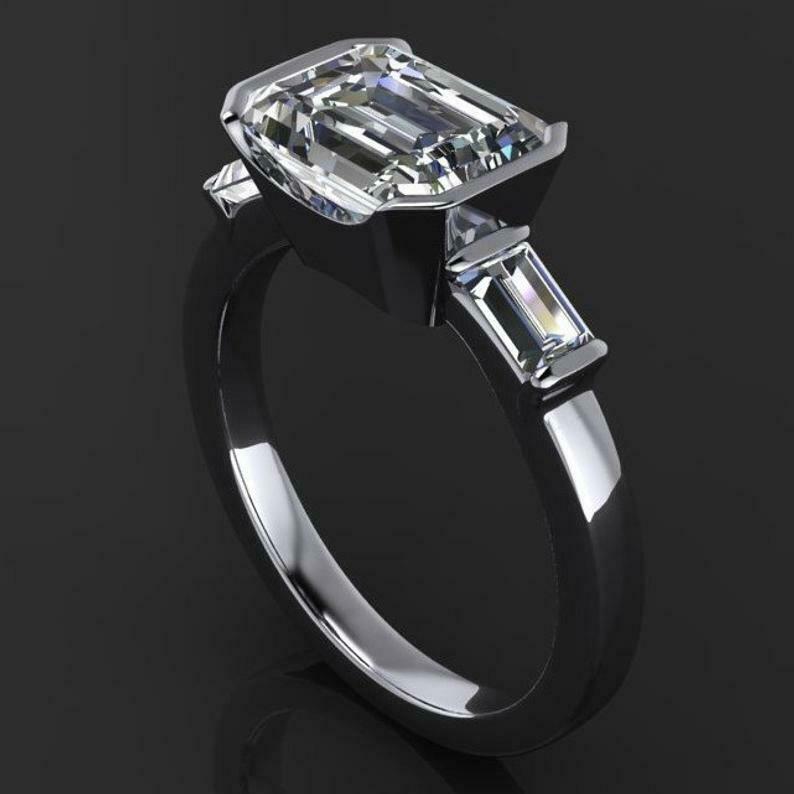Bezel Set Trilogy Engagement Ring 1.6ct Emerald Cut Diamond 14k White Gold Finish