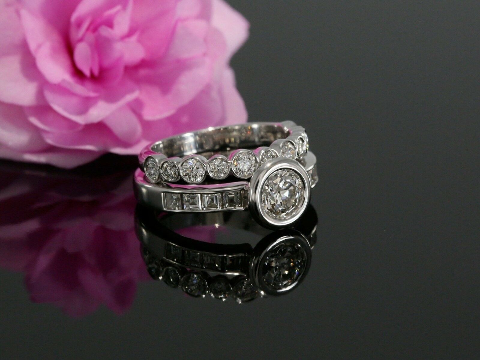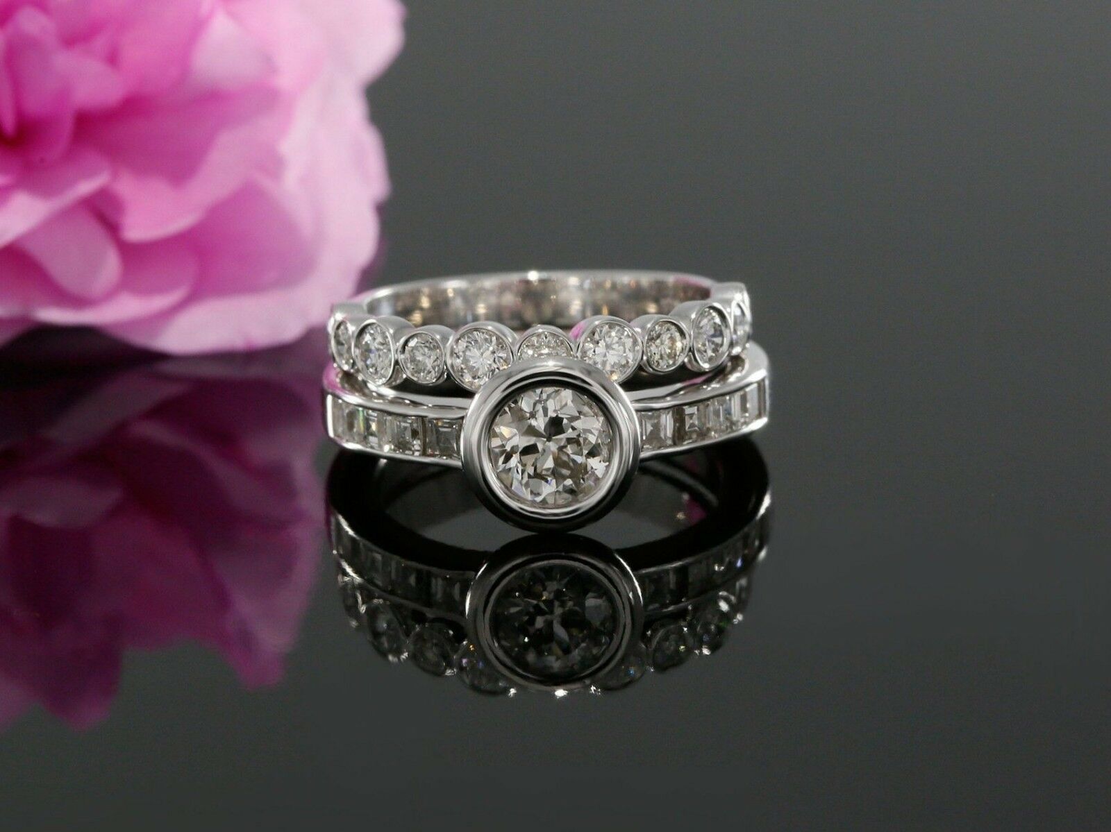 Bezel Wedding Set Engagement Ring 1.9ct Round Cut Diamond 14k White Gold Finish
