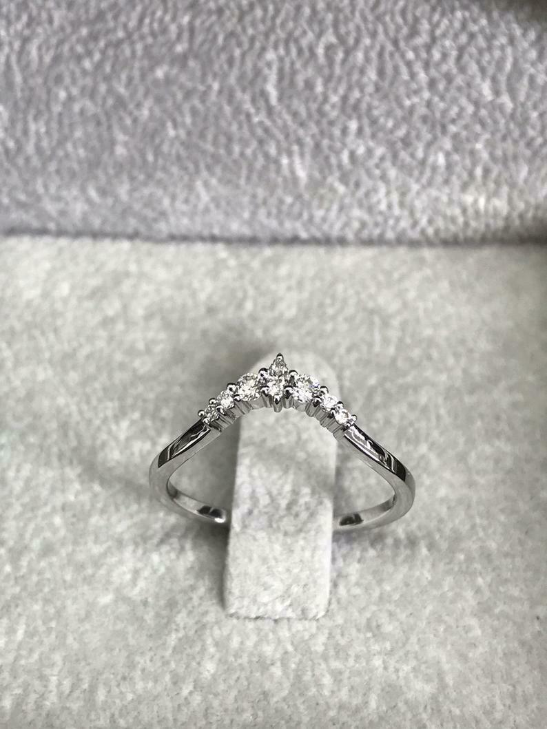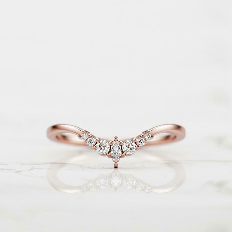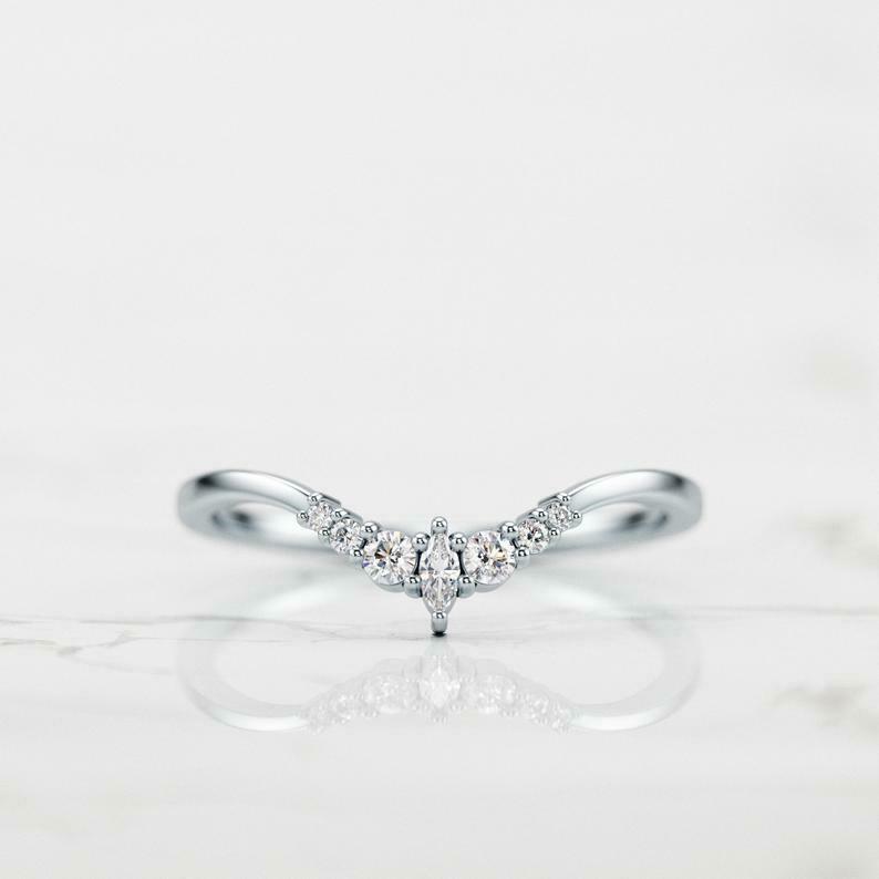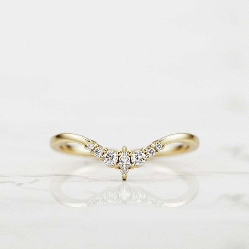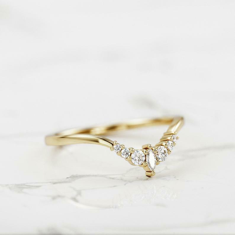 Curved Minimalist Wedding Band 0.3ct Marquise Cut Diamond 14k Yellow Gold Finish