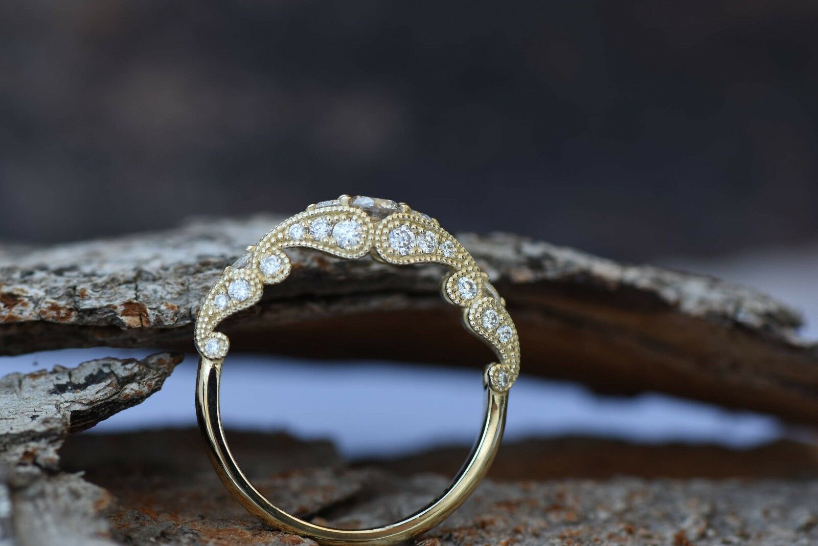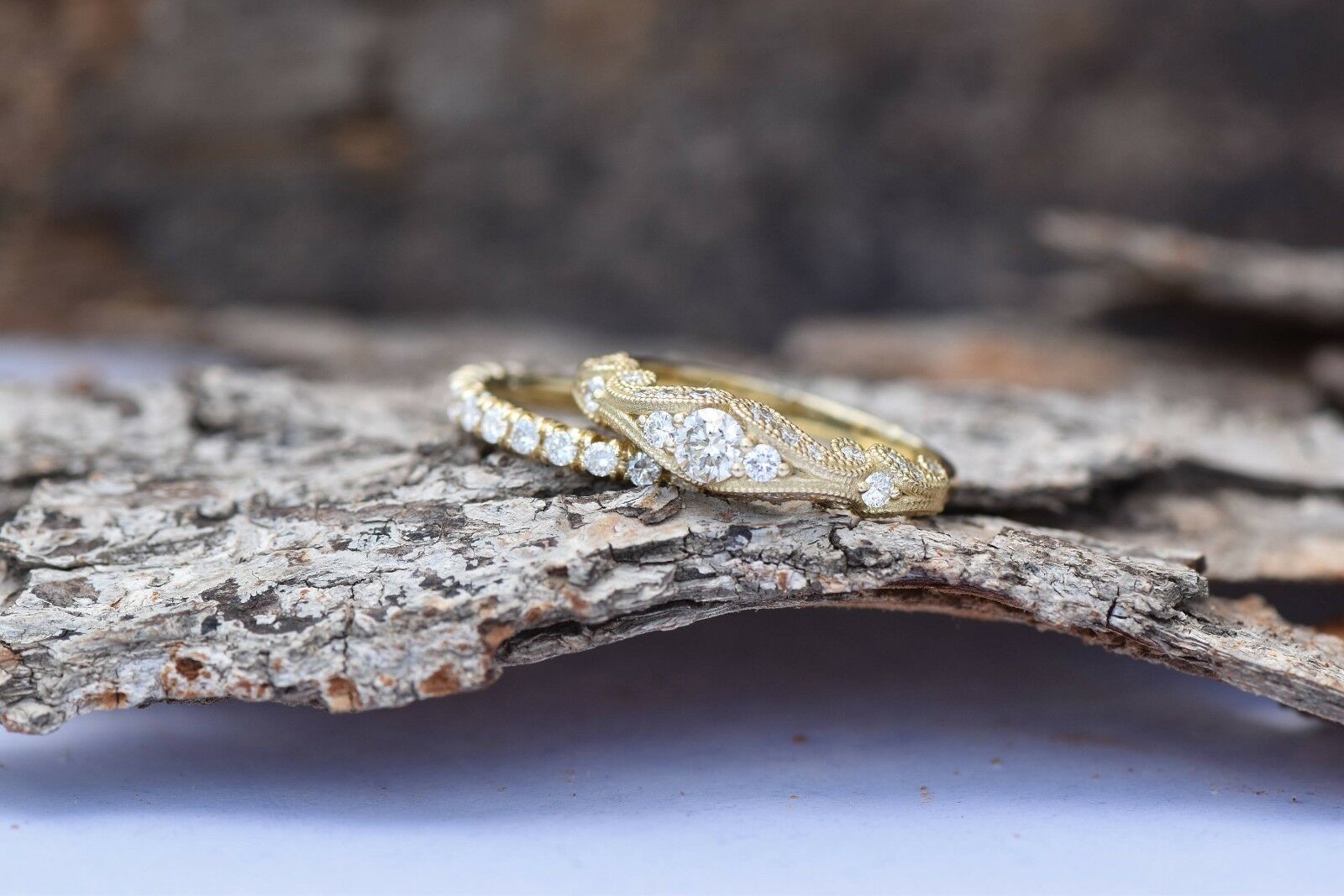 Filigree Bridal Set Engagement Ring 2ct Round Cut Diamond 14k Yellow Gold Finish