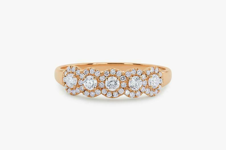 Five Stone Halo Wedding Band 2ct Round Cut VVS1D Diamond 14k Yellow Gold Finish