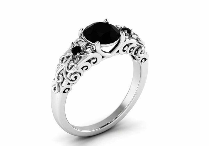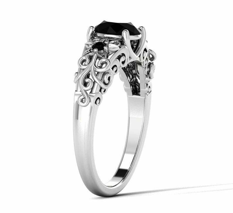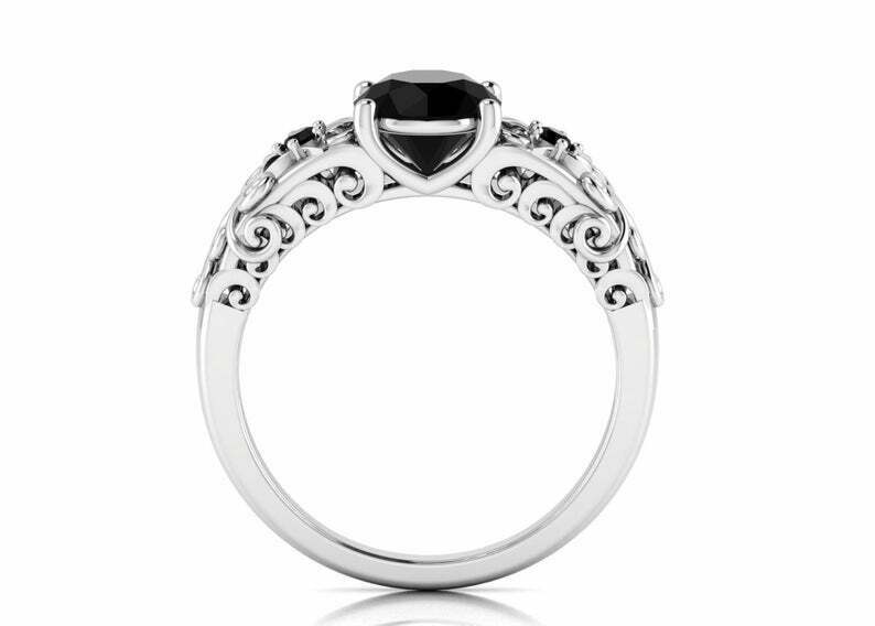 Floral Filigree Solitaire Ring 1.6ct Round Cut Black Diamond 14k White Gold Over