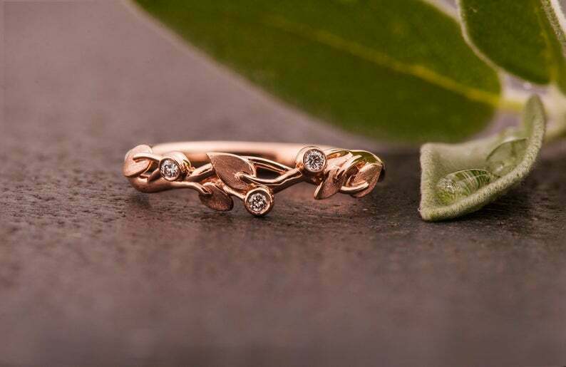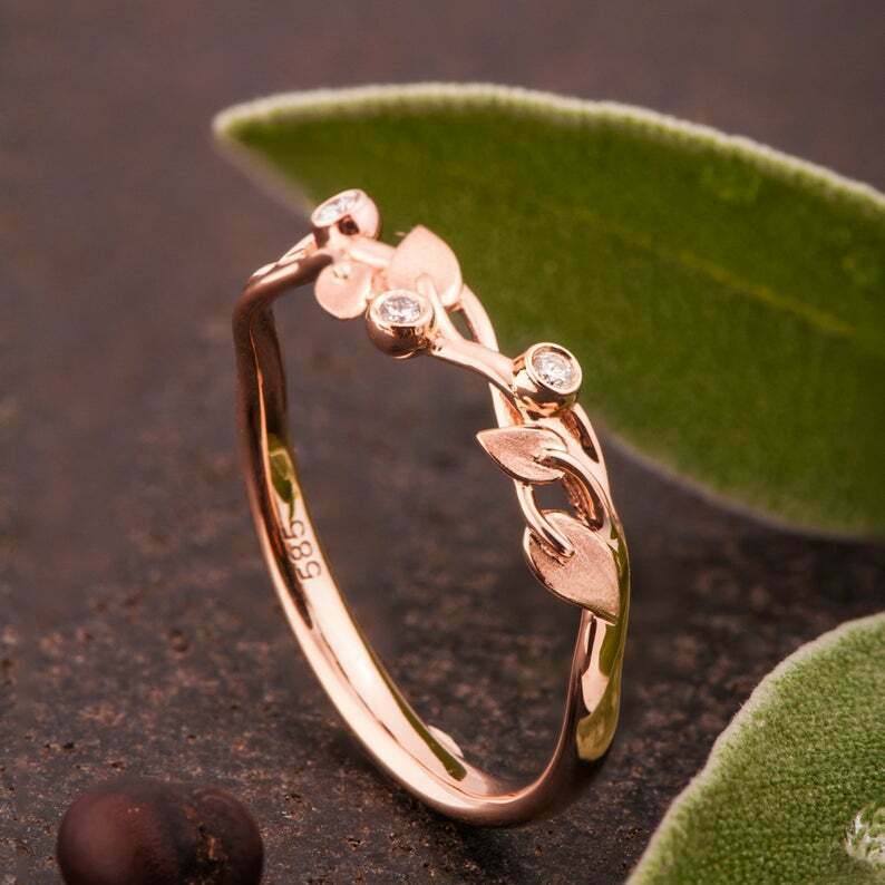 Floral Leaf Vine Engagement Ring 0.15ct Round Cut Diamond 14k Rose Gold Finish