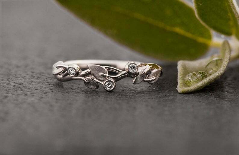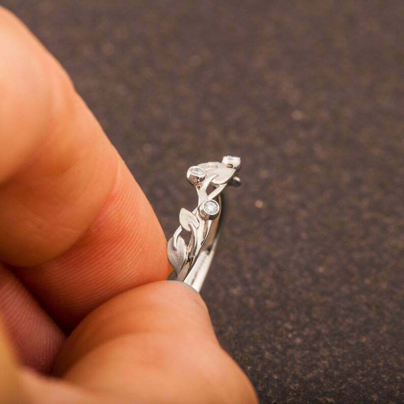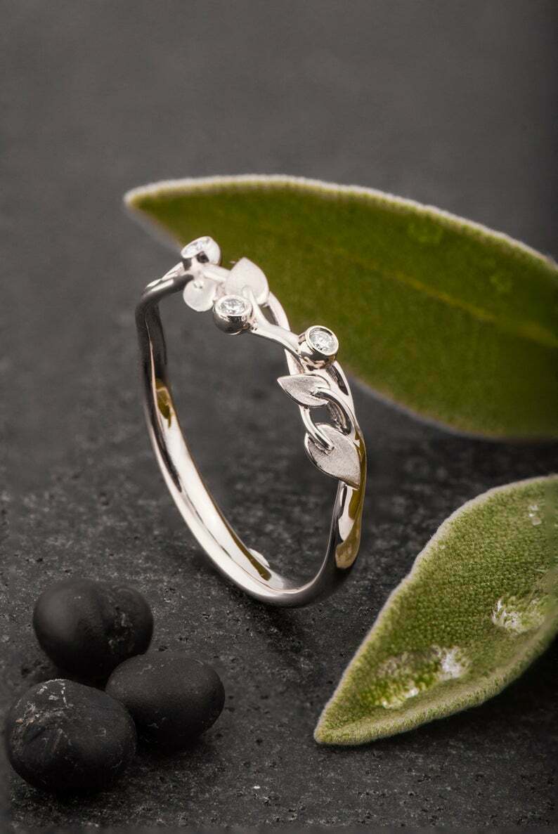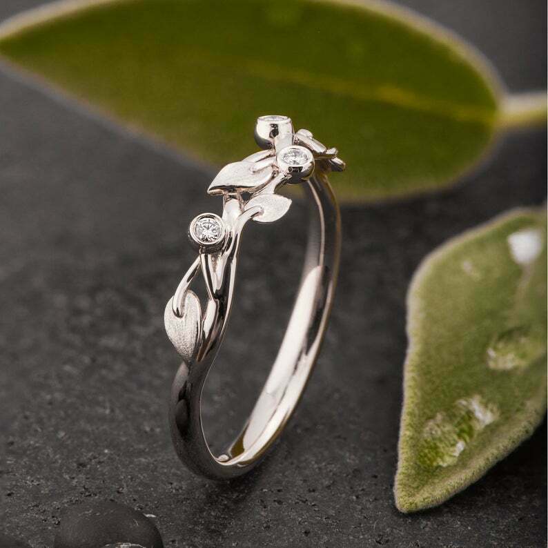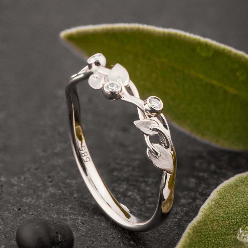 Floral Leaf Vine Engagement Ring 0.15ct Round Cut Diamond 14k White Gold Finish