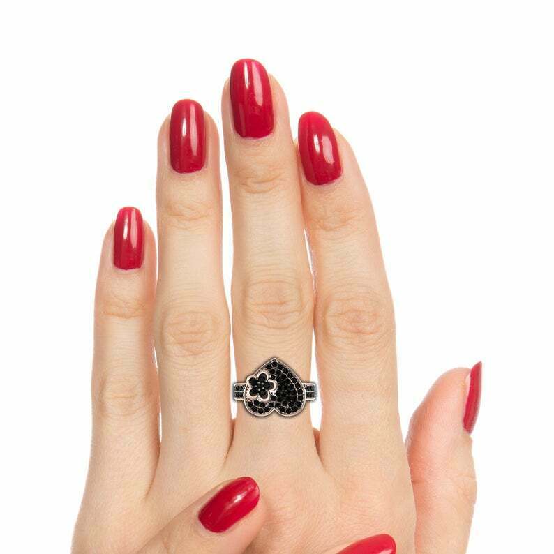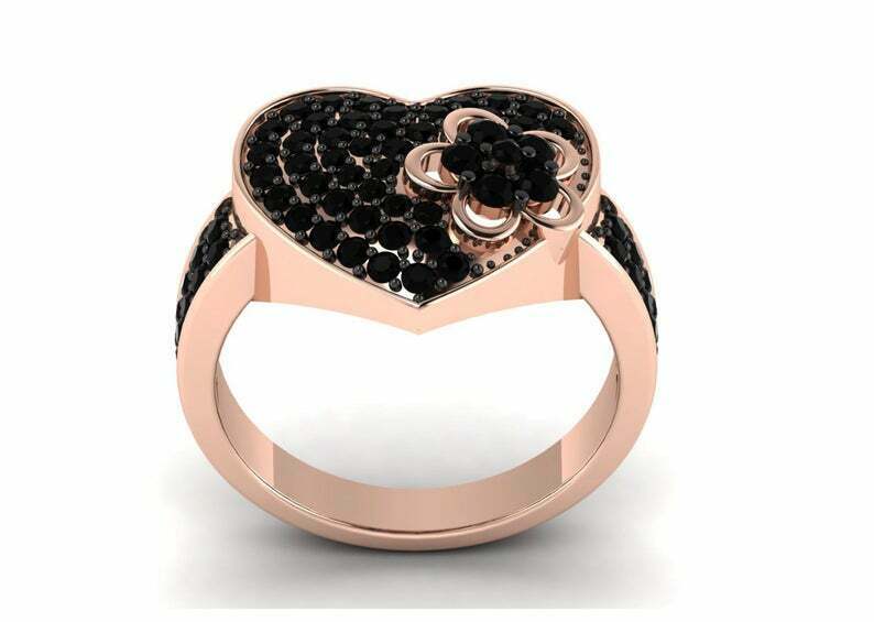 Flower Heart Engagement Ring 2.5ct Round Cut Black Diamond 14k Rose Gold Finish