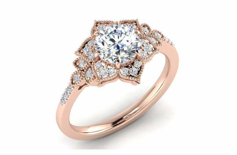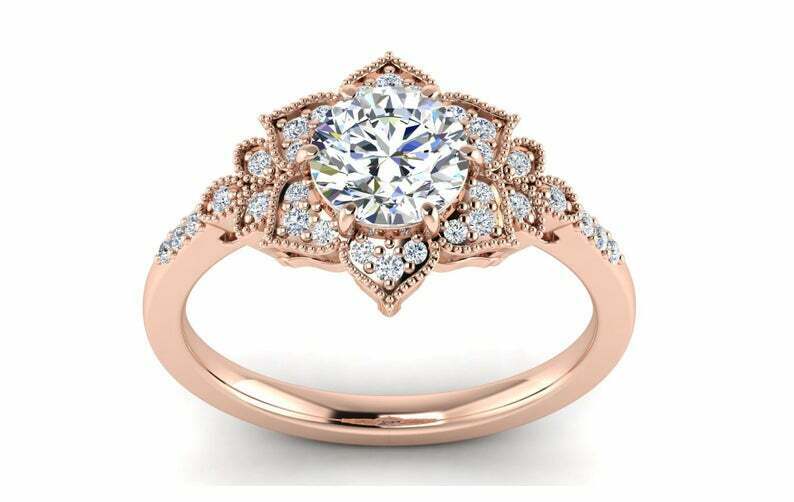 Flower Milgrain Halo Engagement Ring 2.2ct Round Cut Diamond 14k Rose Gold Finish