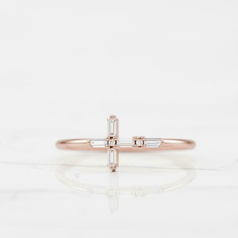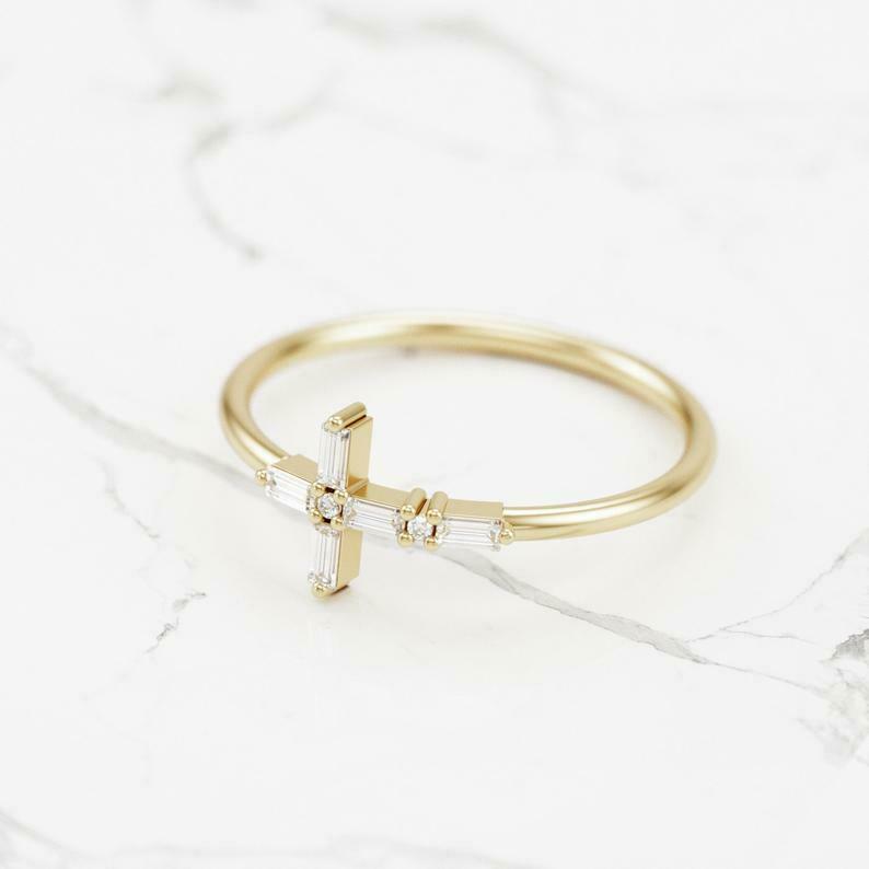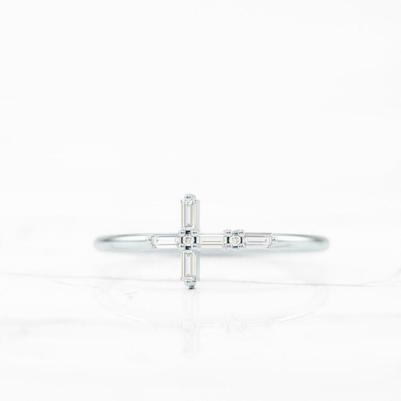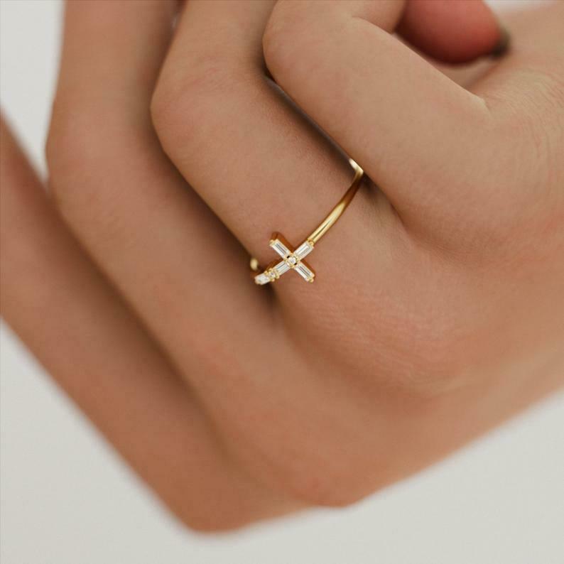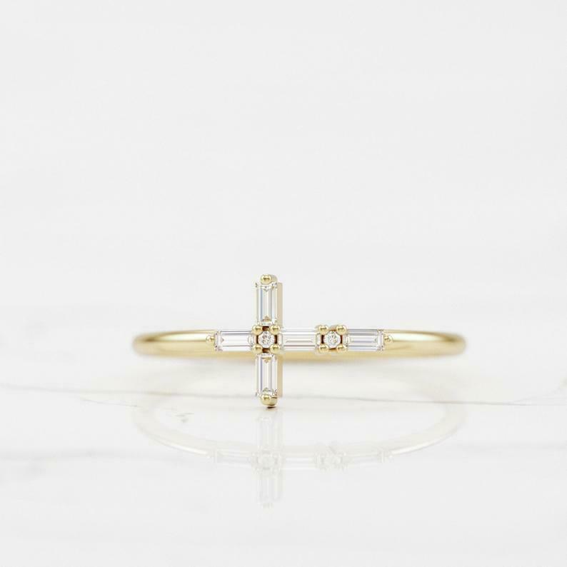Holy Cross Jesus Women Promise Ring 0.5ct Baguette Cut Diamond 14k Yellow Gold Over