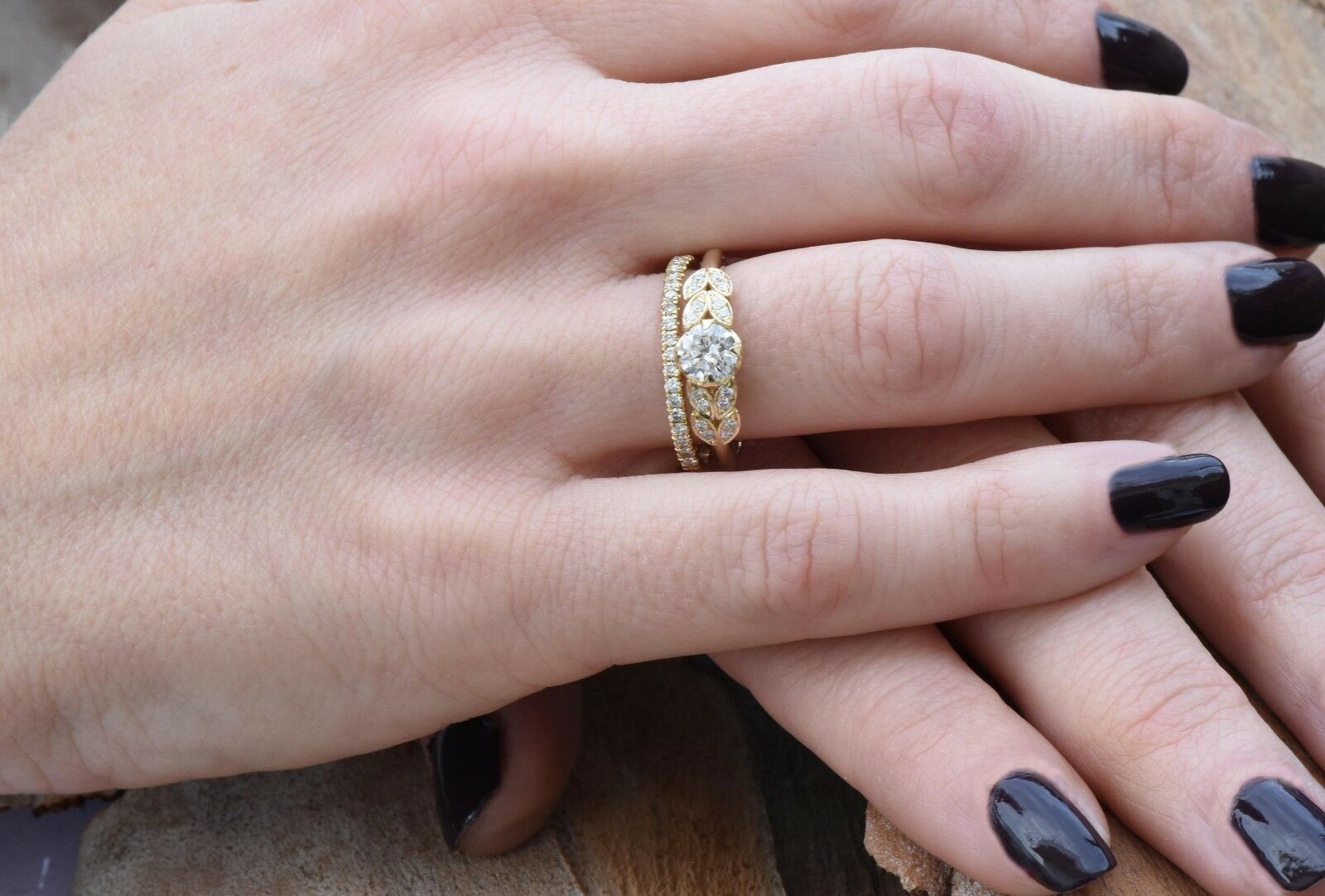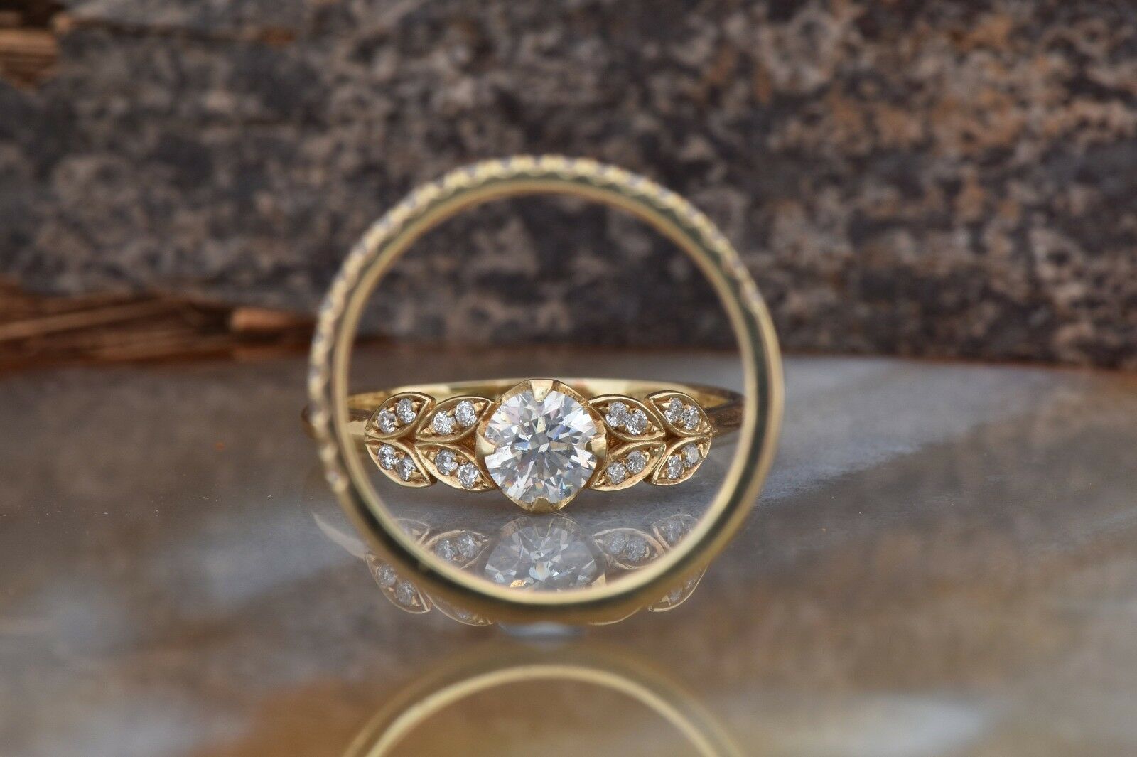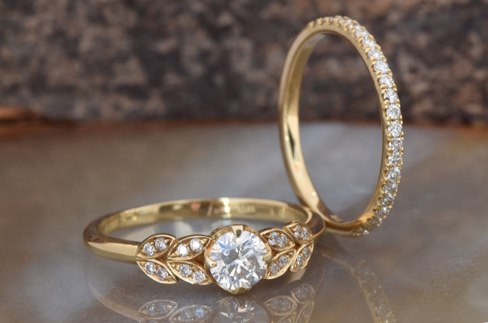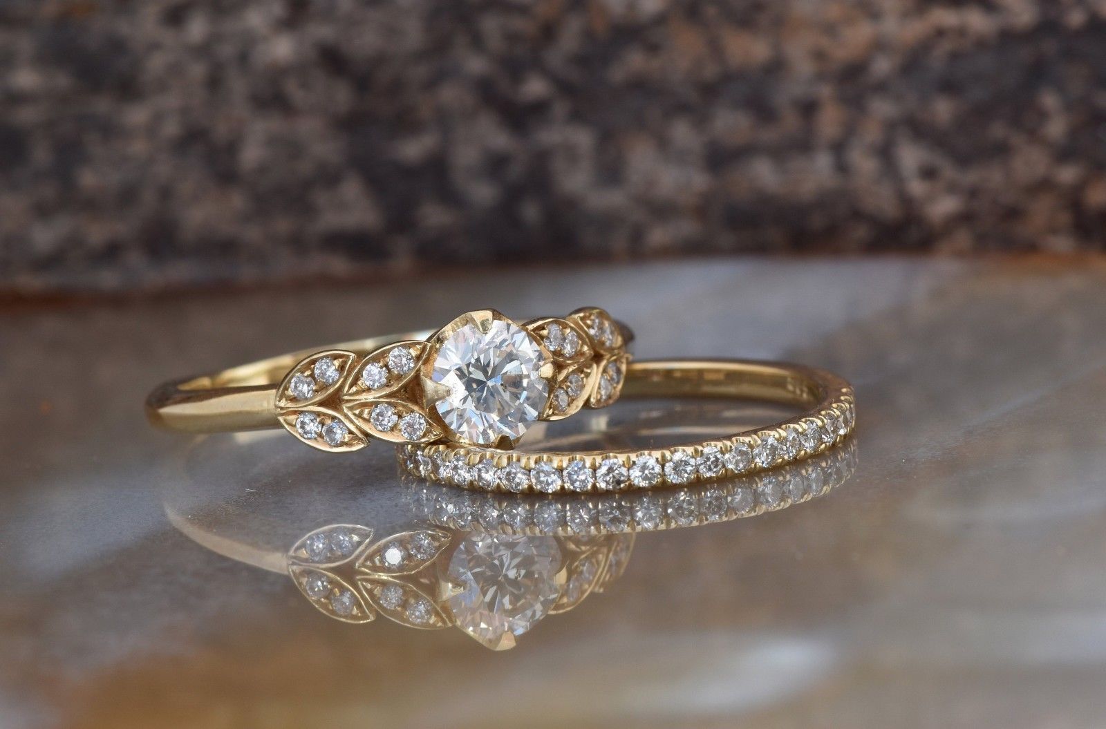 Leaf Bridal Set Engagement Ring 2.5ct Round Cut Diamond 14k Yellow Gold Finish