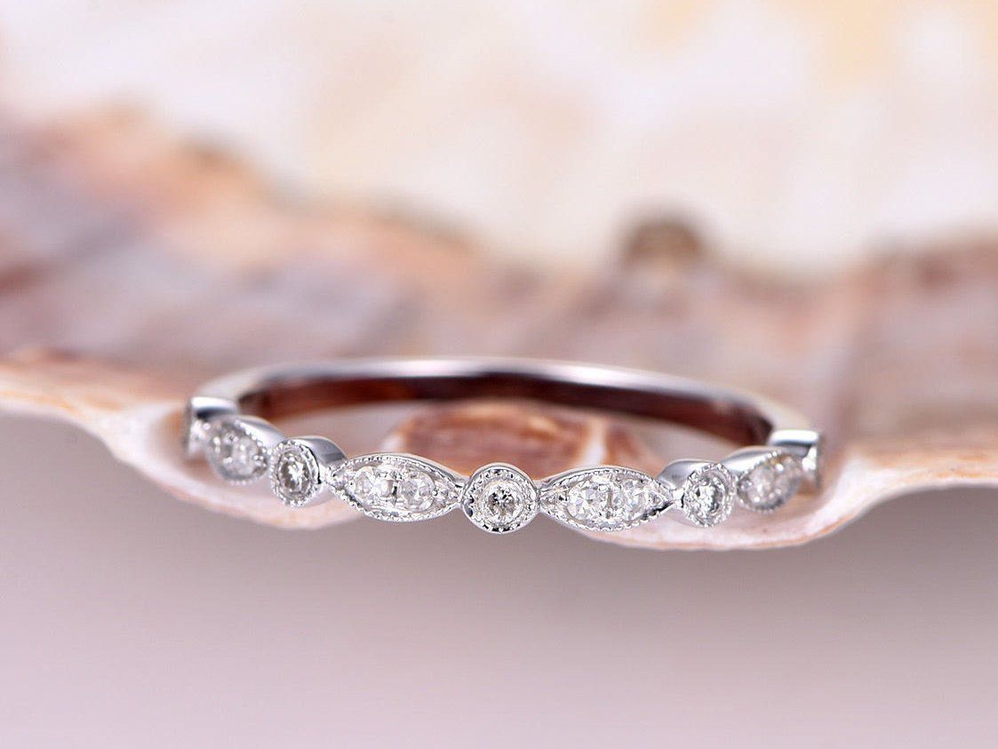 Milgrain Art Deco Wedding Ring Band 1ct Round Cut Diamond 14k White Gold Finish