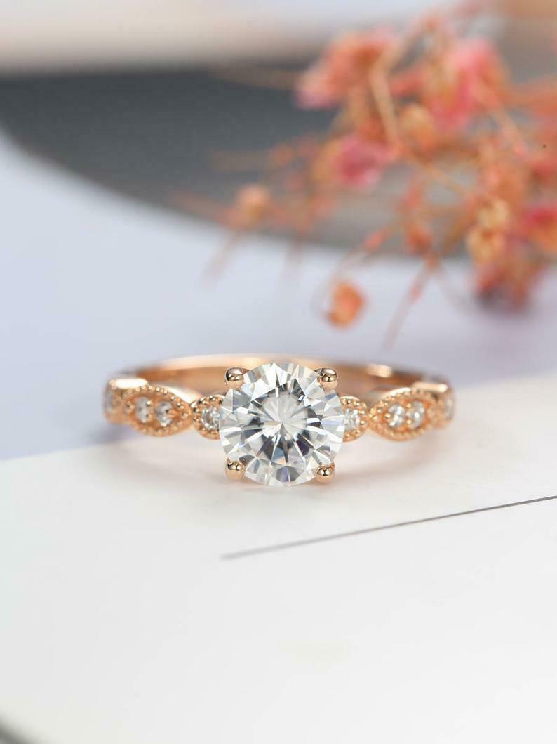 Milgrain Solitaire with Accents Ring 1.5ct Round Cut Diamond 14k RoseGold Finish