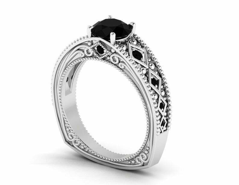Milgrain Solitaire with Accents Ring 2ct Round Cut Black Diamond 14k White Gold Over