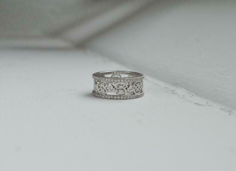 Open Filigree Wide Dual Row Wedding Band 1ct Round Cut Diamond 14k White Gold Finish