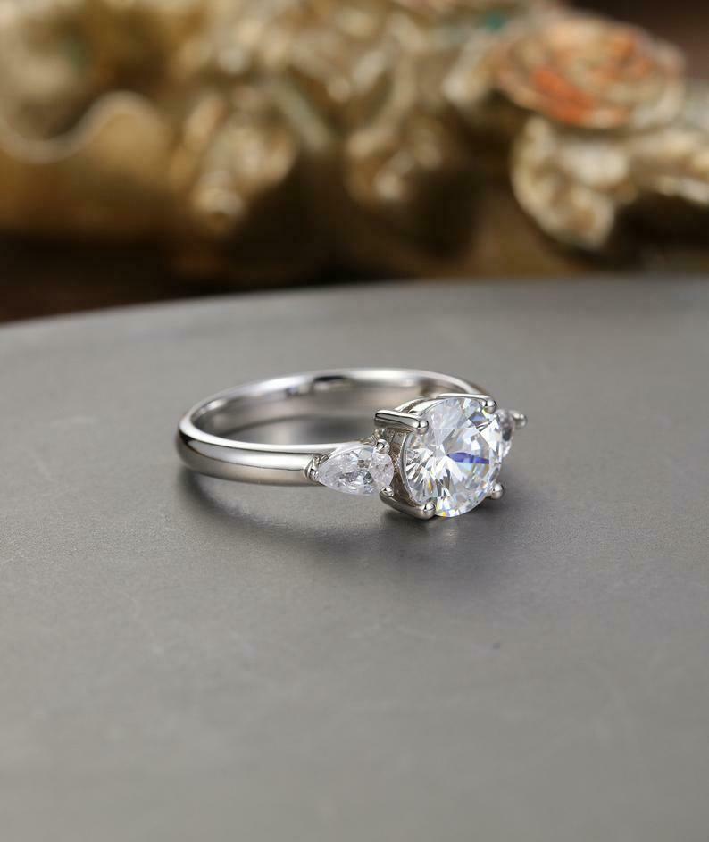 Pear Accents Trilogy Engagement Ring 1.5ct Round Cut Diamond 14k White Gold Over