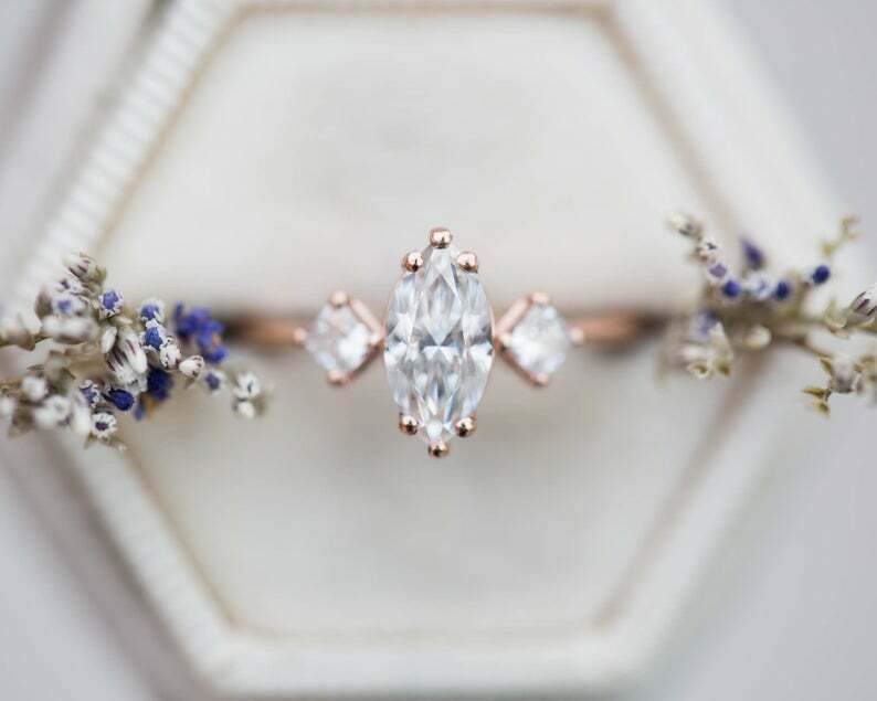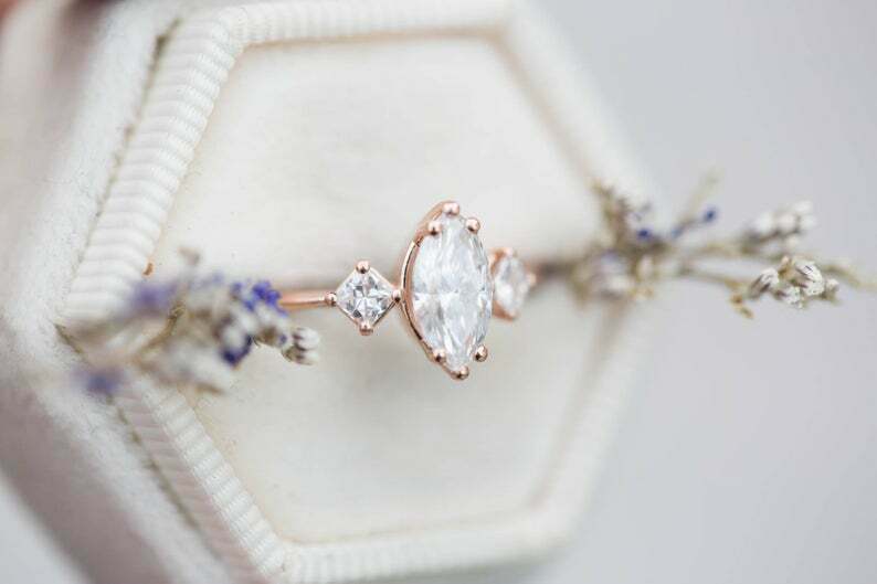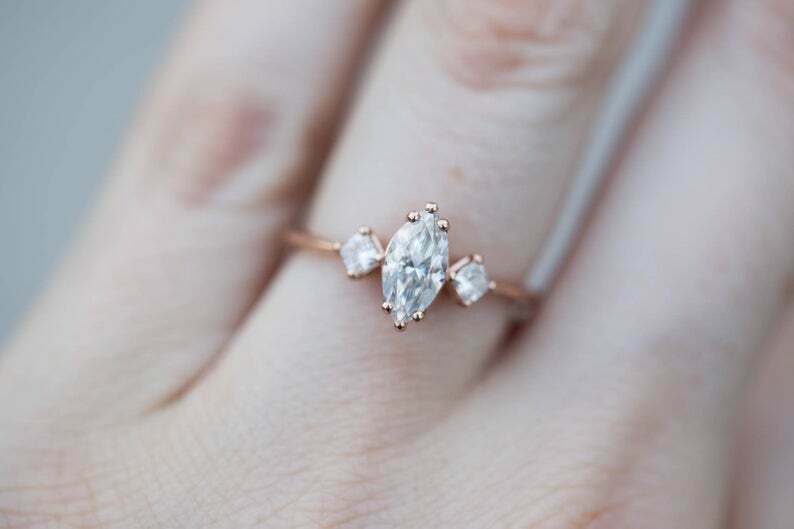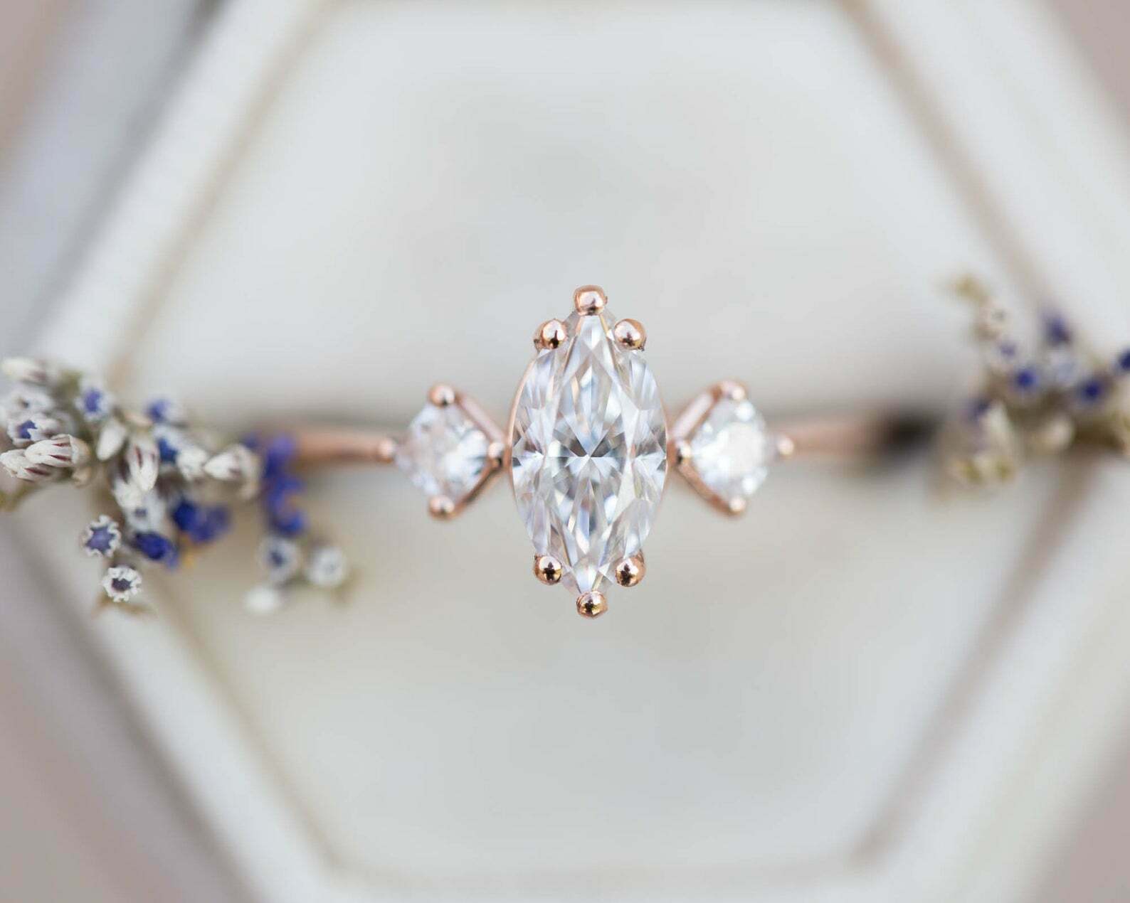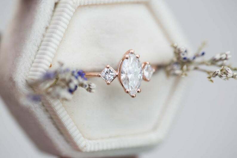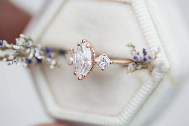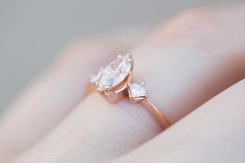 Princess Accents Trilogy Ring 1.5ct Marquise Cut Diamond 14k Rose Gold Finish