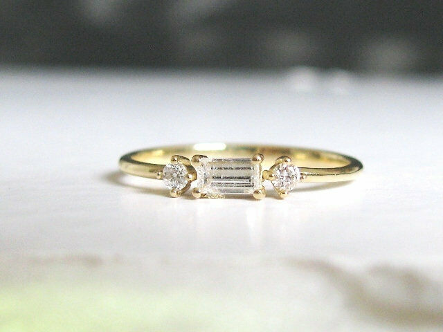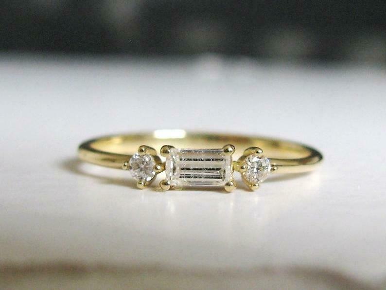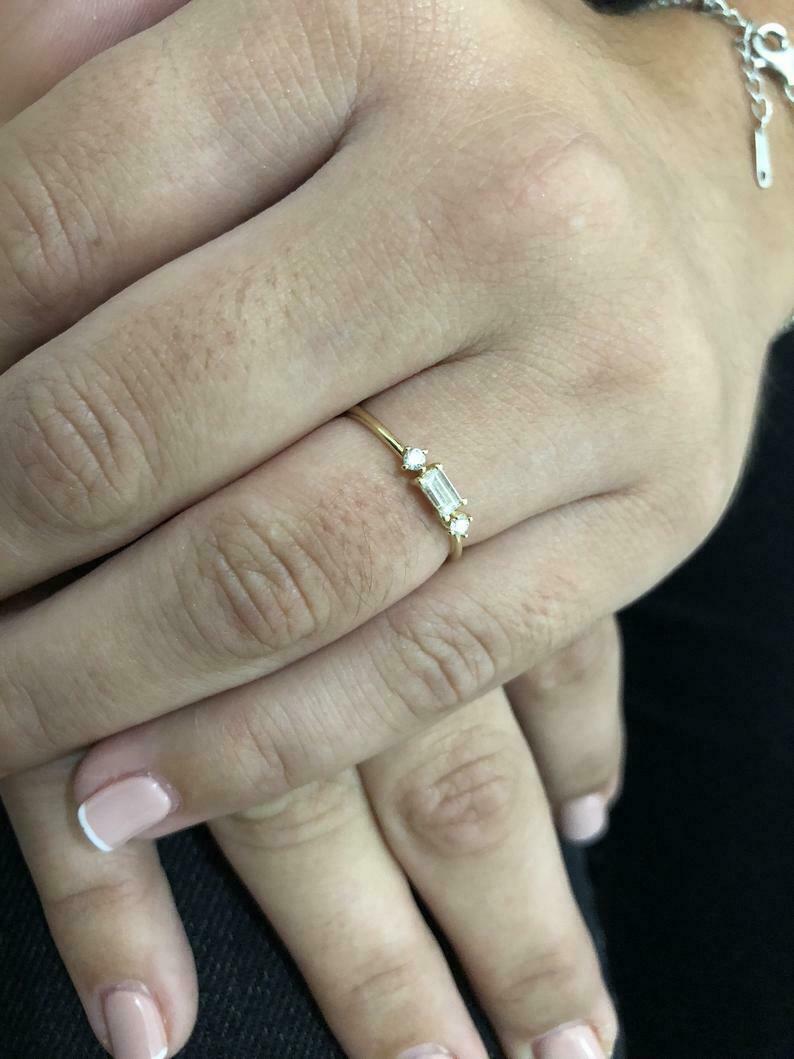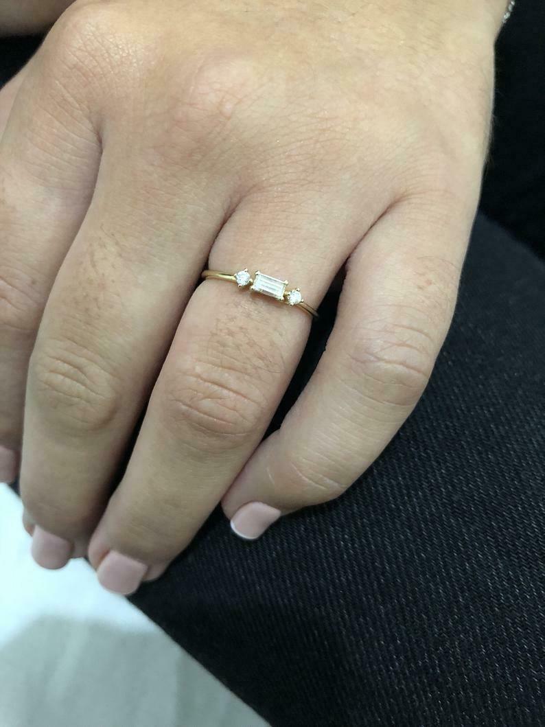 Round Accent Trilogy Engagement Ring 1ct Baguette Cut Diamond 14k Yellow Gold Finish