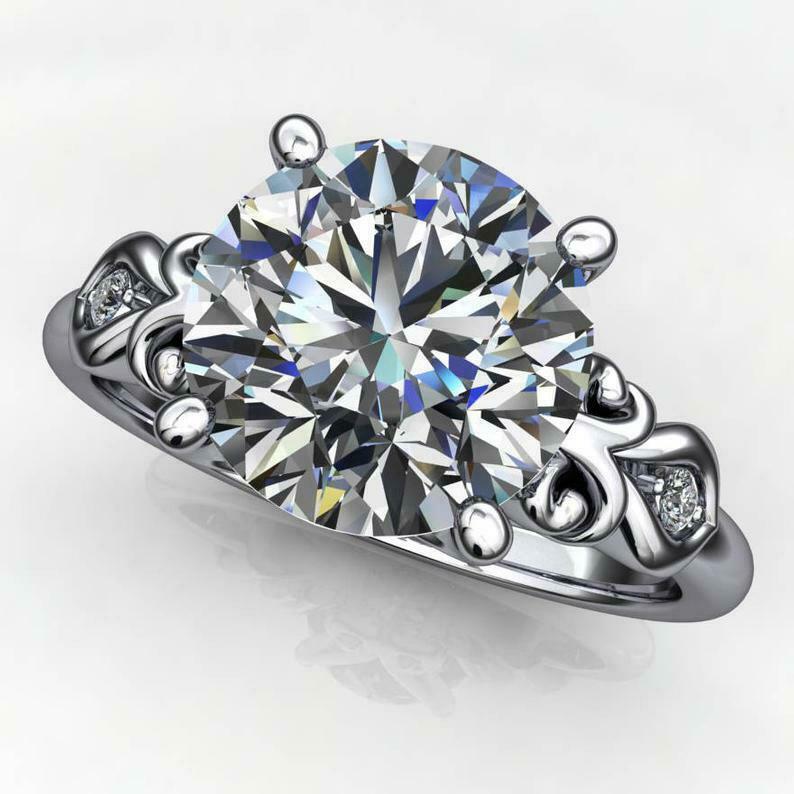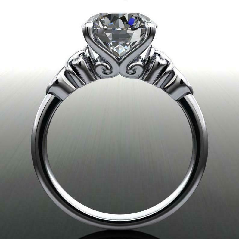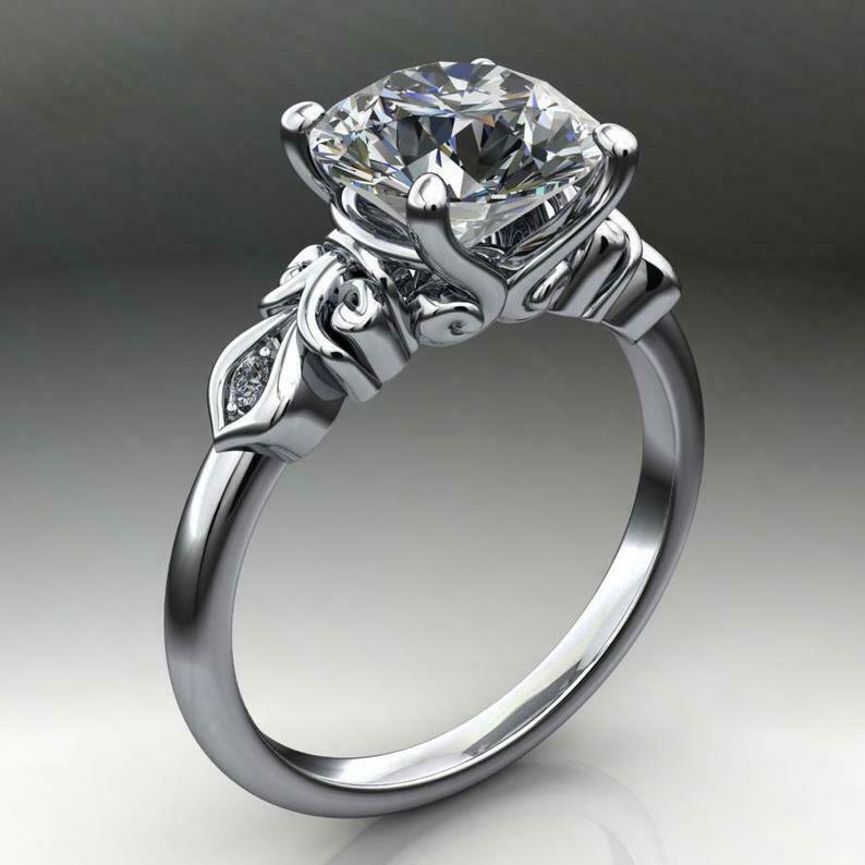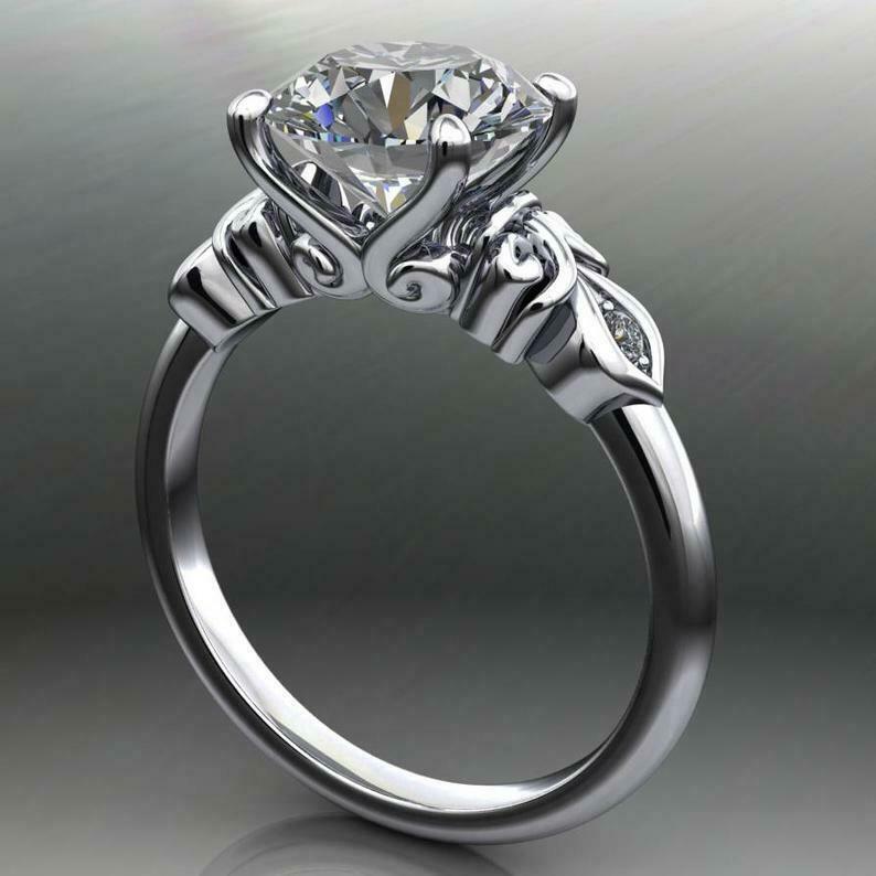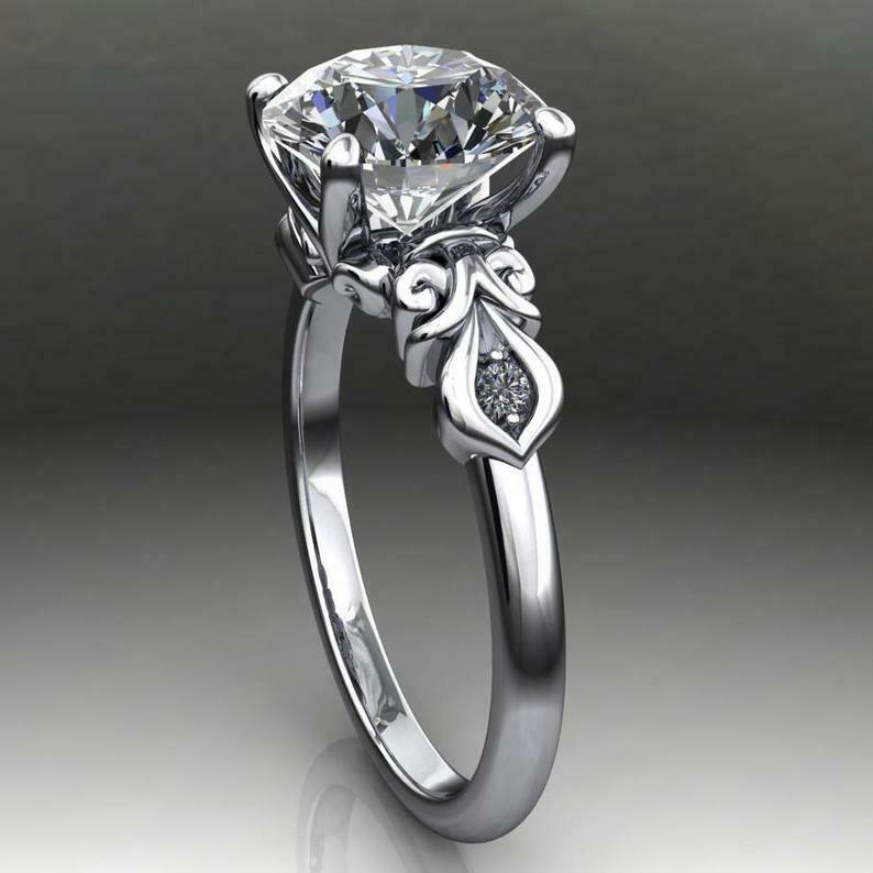 Solitaire Leaf Accent Engagement Ring 2ct Round Cut Diamond 14k White Gold Finish