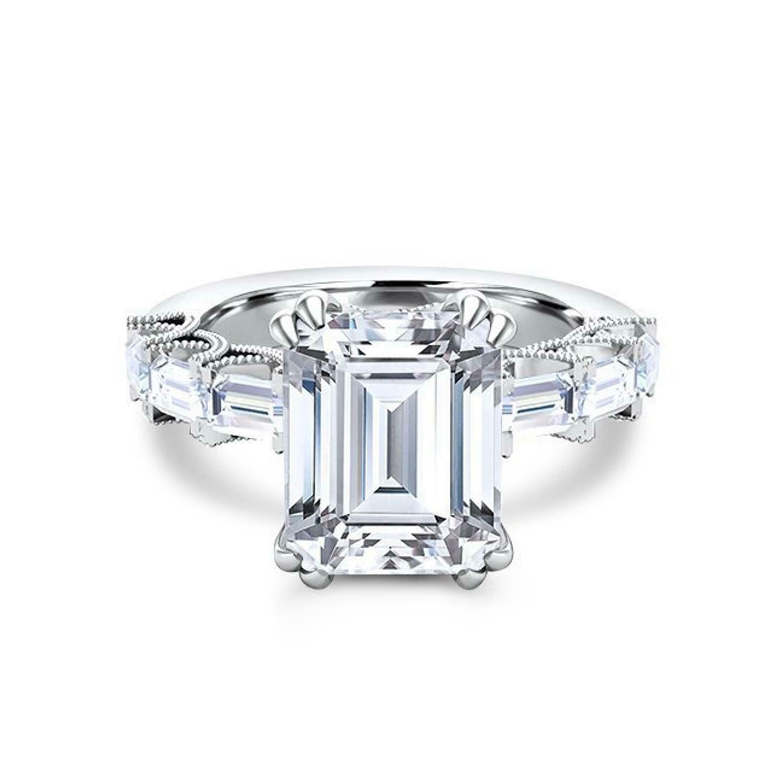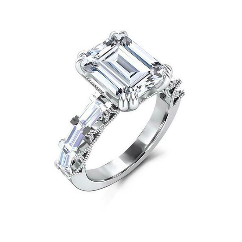 Solitaire with Accent Milgrain Ring 2ct Emerald Cut Diamond 14k White Gold Finish