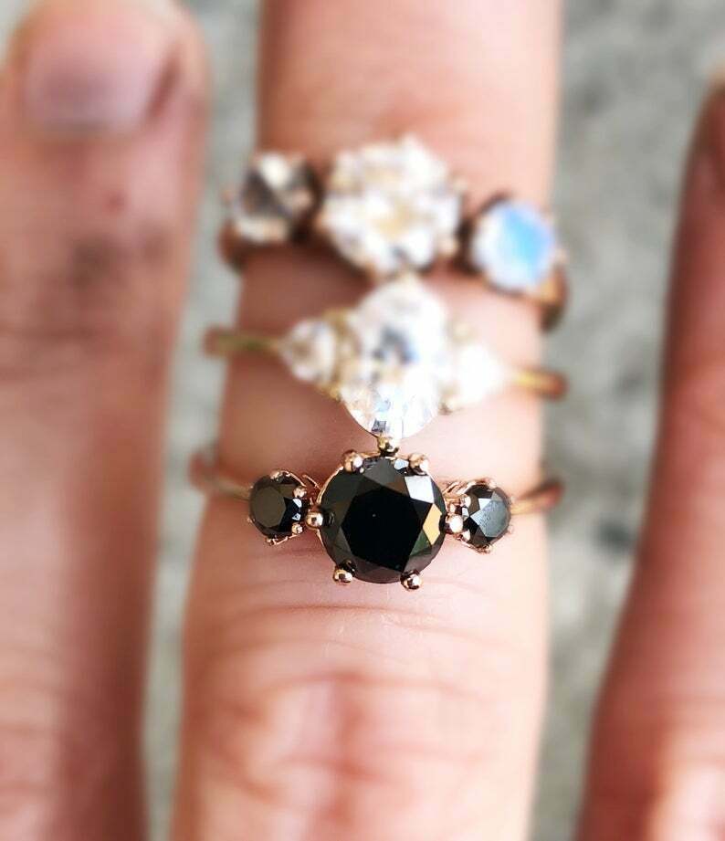 Trilogy Solitaire Engagement Ring 1.5ct Round Black Diamond 14k Rose Gold Finish