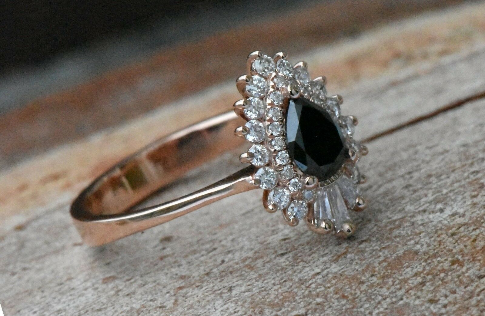 Vintage Promise Engagement Ring 1ct Pear Cut Black Diamond 14k Rose Gold Finish