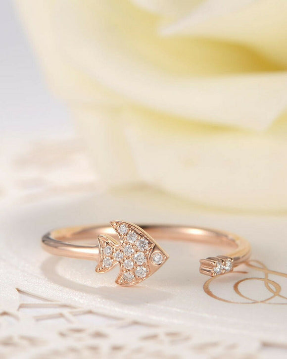 Open Cuff Fish Sea Engagement Ring 0.3ct Round Cut Diamond 14k Rose Gold Finish